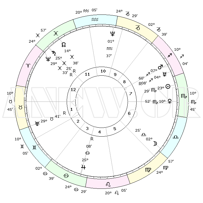 | | ΘΕΣΕΙΣ ΠΛΑΝΗΤΩΝ ΑΣΤΡΟΛΟΓΙΚΟΥ ΧΑΡΤΗ ΤΗΣ ΣΤΙΓΜΗΣ ΑΥΤΗΣ | | | | Πλανήτης | Ζώδιο | Μοίρες | Δεκαήμ. | Σε οίκο | Απόκλιση | | Ακμές των οίκων | | Ηλιος | Σκορπιός | 23°24' | Τρίτο | 8 | 18 S 37 | | 1ος | 21°32' | Ιχθείς | | Σελήνη | Ζυγός | 01°21' | Πρώτο | 7 | 01 S 46 | | 2ος | 03°44' | Ταύρος | | Ερμής | Τοξότης | 04°13'R | Πρώτο | 9 | 22 S 02 | | 3ος | 02°30' | Δίδυμοι | | Αφροδίτη | Σκορπιός | 10°45' | Δεύτερο | 8 | 13 S 55 | | 4ος | 25°14' | Δίδυμοι | | Αρης | Τοξότης | 07°56' | Πρώτο | 9 | 22 S 09 | | 5ος | 17°13' | Καρκίνος | | Δίας | Καρκίνος | 25°08'R | Τρίτο | 5 | 21 N 13 | | 6ος | 13°23' | Λέων | | Κρόνος | Ιχθείς | 25°26'R | Τρίτο | 1 | 04 S 03 | | 7ος | 21°32' | Παρθένος | | Ουρανός | Ταύρος | 29°41'R | Τρίτο | 2 | 19 N 53 | | 8ος | 03°44' | Σκορπιός | | Ποσειδώνας | Ιχθείς | 29°33'R | Τρίτο | 1 | 01 S 26 | | 9ος | 02°30' | Τοξότης | | Πλούτωνας | Υδροχόος | 01°37' | Πρώτο | 11 | 23 S 28 | | 10ος | 25°14' | Τοξότης | | Β. Δεσμός | Ιχθείς | 14°38' | Δεύτερο | 12 | 06 S 03 | | 11ος | 17°13' | Αιγόκερως | | Ωροσκόπος | Ιχθείς | 21°32' | Τρίτο | | | 12ος | 13°23' | Υδροχόος | | Μεσουράνημα | Τοξότης | 25°14' | Τρίτο | | | |