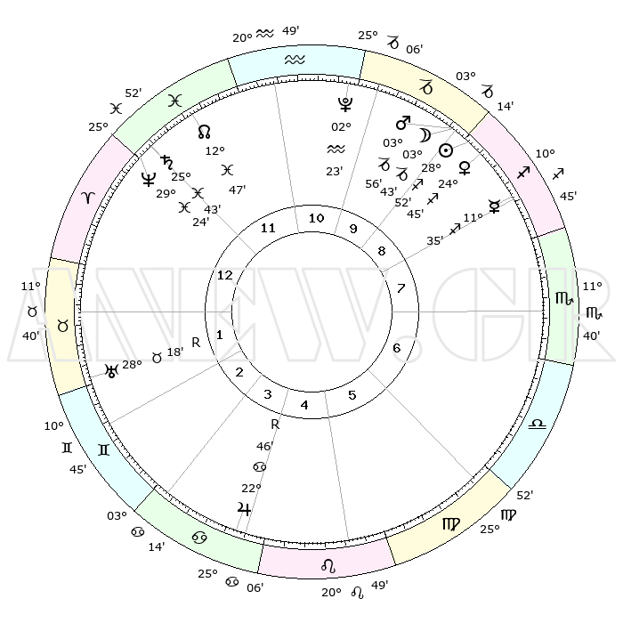| | ΘΕΣΕΙΣ ΠΛΑΝΗΤΩΝ ΑΣΤΡΟΛΟΓΙΚΟΥ ΧΑΡΤΗ ΤΗΣ ΣΤΙΓΜΗΣ ΑΥΤΗΣ | | | | Πλανήτης | Ζώδιο | Μοίρες | Δεκαήμ. | Σε οίκο | Απόκλιση | | Ακμές των οίκων | | Ηλιος | Τοξότης | 28°48' | Τρίτο | 9 | 23 S 26 | | 1ος | 06°30' | Κριός | | Σελήνη | Αιγόκερως | 02°56' | Πρώτο | 9 | 28 S 04 | | 2ος | 15°10' | Ταύρος | | Ερμής | Τοξότης | 11°30' | Δεύτερο | 8 | 21 S 20 | | 3ος | 11°36' | Δίδυμοι | | Αφροδίτη | Τοξότης | 24°41' | Τρίτο | 9 | 23 S 23 | | 4ος | 03°39' | Καρκίνος | | Αρης | Αιγόκερως | 03°53' | Πρώτο | 10 | 24 S 11 | | 5ος | 26°17' | Καρκίνος | | Δίας | Καρκίνος | 22°47'R | Τρίτο | 4 | 21 N 43 | | 6ος | 24°43' | Λέων | | Κρόνος | Ιχθείς | 25°43' | Τρίτο | 12 | 03 S 49 | | 7ος | 06°30' | Ζυγός | | Ουρανός | Ταύρος | 28°18'R | Τρίτο | 2 | 19 N 35 | | 8ος | 15°10' | Σκορπιός | | Ποσειδώνας | Ιχθείς | 29°24' | Τρίτο | 12 | 01 S 28 | | 9ος | 11°36' | Τοξότης | | Πλούτωνας | Υδροχόος | 02°23' | Πρώτο | 11 | 23 S 17 | | 10ος | 03°39' | Αιγόκερως | | Β. Δεσμός | Ιχθείς | 12°47' | Δεύτερο | 12 | 06 S 46 | | 11ος | 26°17' | Αιγόκερως | | Ωροσκόπος | Κριός | 06°30' | Πρώτο | | | 12ος | 24°43' | Υδροχόος | | Μεσουράνημα | Αιγόκερως | 03°39' | Πρώτο | | | |