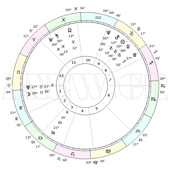 | | ΘΕΣΕΙΣ ΠΛΑΝΗΤΩΝ ΑΣΤΡΟΛΟΓΙΚΟΥ ΧΑΡΤΗ ΤΗΣ ΣΤΙΓΜΗΣ ΑΥΤΗΣ | | | | Πλανήτης | Ζώδιο | Μοίρες | Δεκαήμ. | Σε οίκο | Απόκλιση | | Ακμές των οίκων | | Ηλιος | Αιγόκερως | 09°60' | Πρώτο | 10 | 23 S 03 | | 1ος | 16°42' | Κριός | | Σελήνη | Ταύρος | 28°17' | Τρίτο | 2 | 24 N 35 | | 2ος | 22°37' | Ταύρος | | Ερμής | Τοξότης | 27°48' | Τρίτο | 9 | 23 S 55 | | 3ος | 17°42' | Δίδυμοι | | Αφροδίτη | Αιγόκερως | 08°30' | Πρώτο | 9 | 23 S 39 | | 4ος | 09°29' | Καρκίνος | | Αρης | Αιγόκερως | 12°16' | Δεύτερο | 10 | 23 S 45 | | 5ος | 02°45' | Λέων | | Δίας | Καρκίνος | 21°26'R | Τρίτο | 4 | 21 N 58 | | 6ος | 02°57' | Παρθένος | | Κρόνος | Ιχθείς | 26°15' | Τρίτο | 12 | 03 S 34 | | 7ος | 16°42' | Ζυγός | | Ουρανός | Ταύρος | 27°58'R | Τρίτο | 2 | 19 N 30 | | 8ος | 22°37' | Σκορπιός | | Ποσειδώνας | Ιχθείς | 29°30' | Τρίτο | 12 | 01 S 25 | | 9ος | 17°42' | Τοξότης | | Πλούτωνας | Υδροχόος | 02°42' | Πρώτο | 10 | 23 S 13 | | 10ος | 09°29' | Αιγόκερως | | Β. Δεσμός | Ιχθείς | 12°12' | Δεύτερο | 12 | 06 S 59 | | 11ος | 02°45' | Υδροχόος | | Ωροσκόπος | Κριός | 16°42' | Δεύτερο | | | 12ος | 02°57' | Ιχθείς | | Μεσουράνημα | Αιγόκερως | 09°29' | Πρώτο | | | |