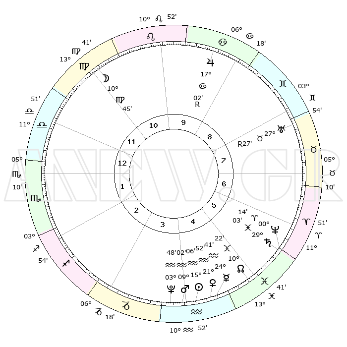 | | ΘΕΣΕΙΣ ΠΛΑΝΗΤΩΝ ΑΣΤΡΟΛΟΓΙΚΟΥ ΧΑΡΤΗ ΤΗΣ ΣΤΙΓΜΗΣ ΑΥΤΗΣ | | | | Πλανήτης | Ζώδιο | Μοίρες | Δεκαήμ. | Σε οίκο | Απόκλιση | | Ακμές των οίκων | | Ηλιος | Υδροχόος | 15°03' | Δεύτερο | 4 | 16 S 19 | | 1ος | 18°58' | Ζυγός | | Σελήνη | Παρθένος | 10°00' | Δεύτερο | 11 | 07 N 44 | | 2ος | 16°45' | Σκορπιός | | Ερμής | Υδροχόος | 24°35' | Τρίτο | 5 | 14 S 54 | | 3ος | 17°59' | Τοξότης | | Αφροδίτη | Υδροχόος | 21°48' | Τρίτο | 4 | 15 S 34 | | 4ος | 21°31' | Αιγόκερως | | Αρης | Υδροχόος | 08°59' | Πρώτο | 4 | 19 S 01 | | 5ος | 24°29' | Υδροχόος | | Δίας | Καρκίνος | 17°03'R | Δεύτερο | 9 | 22 N 39 | | 6ος | 23°60' | Ιχθείς | | Κρόνος | Ιχθείς | 29°03' | Τρίτο | 6 | 02 S 22 | | 7ος | 18°58' | Κριός | | Ουρανός | Ταύρος | 27°27'R | Τρίτο | 8 | 19 N 24 | | 8ος | 16°45' | Ταύρος | | Ποσειδώνας | Κριός | 00°14' | Πρώτο | 6 | 01 S 07 | | 9ος | 17°59' | Δίδυμοι | | Πλούτωνας | Υδροχόος | 03°48' | Πρώτο | 4 | 23 S 00 | | 10ος | 21°32' | Καρκίνος | | Β. Δεσμός | Ιχθείς | 10°23' | Δεύτερο | 5 | 07 S 41 | | 11ος | 24°28' | Λέων | | Ωροσκόπος | Ζυγός | 18°58' | Δεύτερο | | | 12ος | 23°60' | Παρθένος | | Μεσουράνημα | Καρκίνος | 21°32' | Τρίτο | | | |