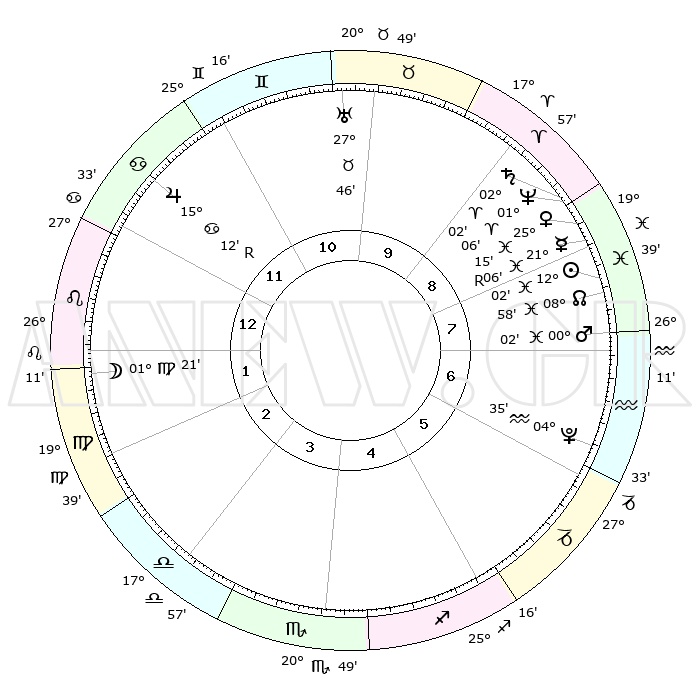 | | ΘΕΣΕΙΣ ΠΛΑΝΗΤΩΝ ΑΣΤΡΟΛΟΓΙΚΟΥ ΧΑΡΤΗ ΤΗΣ ΣΤΙΓΜΗΣ ΑΥΤΗΣ | | | | Πλανήτης | Ζώδιο | Μοίρες | Δεκαήμ. | Σε οίκο | Απόκλιση | | Ακμές των οίκων | | Ηλιος | Ιχθείς | 11°59' | Δεύτερο | 8 | 07 S 04 | | 1ος | 07°41' | Λέων | | Σελήνη | Παρθένος | 00°29' | Πρώτο | 2 | 12 N 02 | | 2ος | 29°19' | Λέων | | Ερμής | Ιχθείς | 21°08'R | Τρίτο | 8 | 00 S 17 | | 3ος | 25°24' | Παρθένος | | Αφροδίτη | Ιχθείς | 25°10' | Τρίτο | 8 | 03 S 09 | | 4ος | 27°16' | Ζυγός | | Αρης | Υδροχόος | 29°59' | Τρίτο | 8 | 12 S 30 | | 5ος | 03°01' | Τοξότης | | Δίας | Καρκίνος | 15°12'R | Δεύτερο | 12 | 22 N 55 | | 6ος | 07°30' | Αιγόκερως | | Κρόνος | Κριός | 02°01' | Πρώτο | 9 | 01 S 09 | | 7ος | 07°41' | Υδροχόος | | Ουρανός | Ταύρος | 27°46' | Τρίτο | 10 | 19 N 29 | | 8ος | 29°19' | Υδροχόος | | Ποσειδώνας | Κριός | 01°06' | Πρώτο | 9 | 00 S 46 | | 9ος | 25°24' | Ιχθείς | | Πλούτωνας | Υδροχόος | 04°35' | Πρώτο | 6 | 22 S 52 | | 10ος | 27°16' | Κριός | | Β. Δεσμός | Ιχθείς | 08°58' | Πρώτο | 8 | 08 S 12 | | 11ος | 03°01' | Δίδυμοι | | Ωροσκόπος | Λέων | 07°41' | Πρώτο | | | 12ος | 07°30' | Καρκίνος | | Μεσουράνημα | Κριός | 27°16' | Τρίτο | | | |