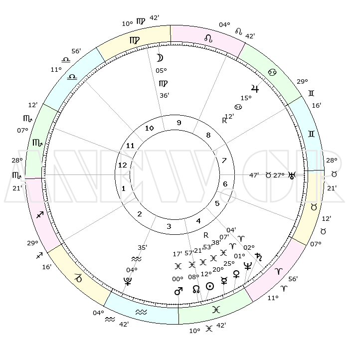| | ΘΕΣΕΙΣ ΠΛΑΝΗΤΩΝ ΑΣΤΡΟΛΟΓΙΚΟΥ ΧΑΡΤΗ ΤΗΣ ΣΤΙΓΜΗΣ ΑΥΤΗΣ | | | | Πλανήτης | Ζώδιο | Μοίρες | Δεκαήμ. | Σε οίκο | Απόκλιση | | Ακμές των οίκων | | Ηλιος | Ιχθείς | 12°17' | Δεύτερο | 4 | 06 S 57 | | 1ος | 09°14' | Σκορπιός | | Σελήνη | Παρθένος | 04°42' | Πρώτο | 10 | 10 N 09 | | 2ος | 08°15' | Τοξότης | | Ερμής | Ιχθείς | 20°56'R | Τρίτο | 5 | 00 S 20 | | 3ος | 11°03' | Αιγόκερως | | Αφροδίτη | Ιχθείς | 25°34' | Τρίτο | 5 | 02 S 59 | | 4ος | 15°55' | Υδροχόος | | Αρης | Ιχθείς | 00°14' | Πρώτο | 4 | 12 S 25 | | 5ος | 18°37' | Ιχθείς | | Δίας | Καρκίνος | 15°12'R | Δεύτερο | 9 | 22 N 55 | | 6ος | 16°20' | Κριός | | Κρόνος | Κριός | 02°04' | Πρώτο | 5 | 01 S 08 | | 7ος | 09°14' | Ταύρος | | Ουρανός | Ταύρος | 27°46' | Τρίτο | 7 | 19 N 29 | | 8ος | 08°15' | Δίδυμοι | | Ποσειδώνας | Κριός | 01°07' | Πρώτο | 5 | 00 S 45 | | 9ος | 11°03' | Καρκίνος | | Πλούτωνας | Υδροχόος | 04°35' | Πρώτο | 3 | 22 S 52 | | 10ος | 15°55' | Λέων | | Β. Δεσμός | Ιχθείς | 08°57' | Πρώτο | 4 | 08 S 13 | | 11ος | 18°37' | Παρθένος | | Ωροσκόπος | Σκορπιός | 09°14' | Πρώτο | | | 12ος | 16°20' | Ζυγός | | Μεσουράνημα | Λέων | 15°55' | Δεύτερο | | | |