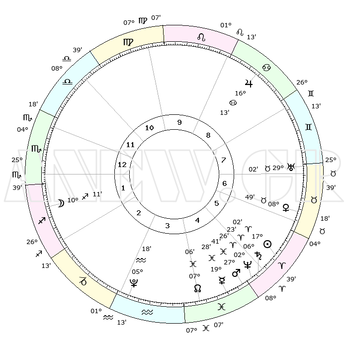 | | ΘΕΣΕΙΣ ΠΛΑΝΗΤΩΝ ΑΣΤΡΟΛΟΓΙΚΟΥ ΧΑΡΤΗ ΤΗΣ ΣΤΙΓΜΗΣ ΑΥΤΗΣ | | | | Πλανήτης | Ζώδιο | Μοίρες | Δεκαήμ. | Σε οίκο | Απόκλιση | | Ακμές των οίκων | | Ηλιος | Κριός | 16°58' | Δεύτερο | 6 | 06 N 40 | | 1ος | 06°44' | Σκορπιός | | Σελήνη | Τοξότης | 09°25' | Πρώτο | 2 | 26 S 57 | | 2ος | 05°35' | Τοξότης | | Ερμής | Ιχθείς | 19°24' | Δεύτερο | 5 | 06 S 05 | | 3ος | 08°08' | Αιγόκερως | | Αφροδίτη | Ταύρος | 08°45' | Πρώτο | 7 | 14 N 13 | | 4ος | 12°48' | Υδροχόος | | Αρης | Ιχθείς | 27°38' | Τρίτο | 5 | 01 S 53 | | 5ος | 15°35' | Ιχθείς | | Δίας | Καρκίνος | 16°12' | Δεύτερο | 9 | 22 N 49 | | 6ος | 13°35' | Κριός | | Κρόνος | Κριός | 06°23' | Πρώτο | 5 | 00 N 34 | | 7ος | 06°44' | Ταύρος | | Ουρανός | Ταύρος | 29°01' | Τρίτο | 7 | 19 N 46 | | 8ος | 05°35' | Δίδυμοι | | Ποσειδώνας | Κριός | 02°26' | Πρώτο | 5 | 00 S 14 | | 9ος | 08°08' | Καρκίνος | | Πλούτωνας | Υδροχόος | 05°18' | Πρώτο | 3 | 22 S 47 | | 10ος | 12°48' | Λέων | | Β. Δεσμός | Ιχθείς | 07°06' | Πρώτο | 4 | 08 S 54 | | 11ος | 15°35' | Παρθένος | | Ωροσκόπος | Σκορπιός | 06°44' | Πρώτο | | | 12ος | 13°35' | Ζυγός | | Μεσουράνημα | Λέων | 12°48' | Δεύτερο | | | |