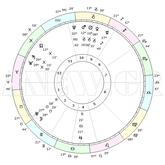 | | ΘΕΣΕΙΣ ΠΛΑΝΗΤΩΝ ΑΣΤΡΟΛΟΓΙΚΟΥ ΧΑΡΤΗ ΤΗΣ ΣΤΙΓΜΗΣ ΑΥΤΗΣ | | | | Πλανήτης | Ζώδιο | Μοίρες | Δεκαήμ. | Σε οίκο | Απόκλιση | | Ακμές των οίκων | | Ηλιος | Αιγόκερως | 09°56' | Πρώτο | 10 | 23 S 04 | | 1ος | 13°01' | Ιχθείς | | Σελήνη | Ταύρος | 27°26' | Τρίτο | 3 | 24 N 22 | | 2ος | 26°49' | Κριός | | Ερμής | Τοξότης | 27°43' | Τρίτο | 10 | 23 S 55 | | 3ος | 27°04' | Ταύρος | | Αφροδίτη | Αιγόκερως | 08°26' | Πρώτο | 10 | 23 S 39 | | 4ος | 20°21' | Δίδυμοι | | Αρης | Αιγόκερως | 12°13' | Δεύτερο | 11 | 23 S 45 | | 5ος | 12°08' | Καρκίνος | | Δίας | Καρκίνος | 21°26'R | Τρίτο | 5 | 21 N 58 | | 6ος | 07°10' | Λέων | | Κρόνος | Ιχθείς | 26°15' | Τρίτο | 1 | 03 S 34 | | 7ος | 13°01' | Παρθένος | | Ουρανός | Ταύρος | 27°58'R | Τρίτο | 3 | 19 N 30 | | 8ος | 26°49' | Ζυγός | | Ποσειδώνας | Ιχθείς | 29°30' | Τρίτο | 1 | 01 S 25 | | 9ος | 27°04' | Σκορπιός | | Πλούτωνας | Υδροχόος | 02°42' | Πρώτο | 11 | 23 S 13 | | 10ος | 20°21' | Τοξότης | | Β. Δεσμός | Ιχθείς | 12°12' | Δεύτερο | 12 | 06 S 59 | | 11ος | 12°08' | Αιγόκερως | | Ωροσκόπος | Ιχθείς | 13°01' | Δεύτερο | | | 12ος | 07°11' | Υδροχόος | | Μεσουράνημα | Τοξότης | 20°21' | Τρίτο | | | |
