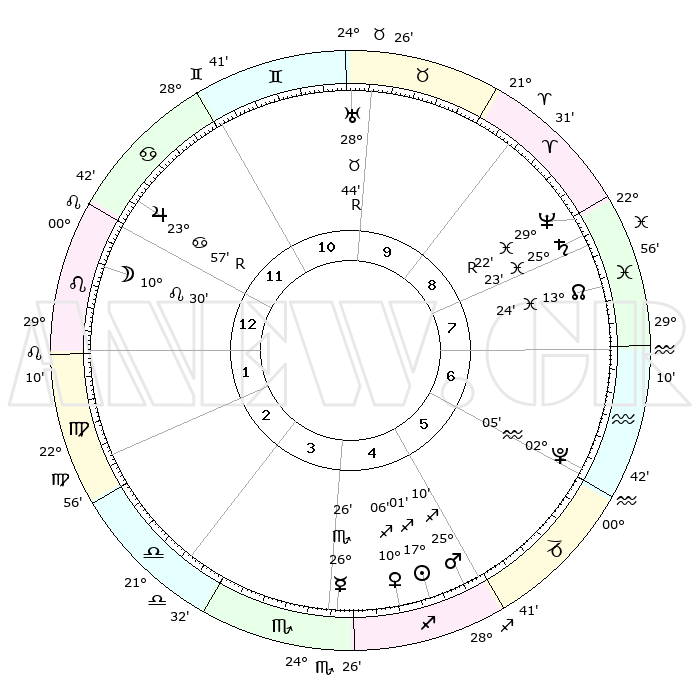 | | ΘΕΣΕΙΣ ΠΛΑΝΗΤΩΝ ΑΣΤΡΟΛΟΓΙΚΟΥ ΧΑΡΤΗ ΤΗΣ ΣΤΙΓΜΗΣ ΑΥΤΗΣ | | | | Πλανήτης | Ζώδιο | Μοίρες | Δεκαήμ. | Σε οίκο | Απόκλιση | | Ακμές των οίκων | | Ηλιος | Τοξότης | 16°59' | Δεύτερο | 4 | 22 S 48 | | 1ος | 19°30' | Λέων | | Σελήνη | Λέων | 10°02' | Δεύτερο | 12 | 20 N 23 | | 2ος | 12°15' | Παρθένος | | Ερμής | Σκορπιός | 26°24' | Τρίτο | 4 | 17 S 10 | | 3ος | 09°50' | Ζυγός | | Αφροδίτη | Τοξότης | 10°03' | Δεύτερο | 4 | 21 S 33 | | 4ος | 12°29' | Σκορπιός | | Αρης | Τοξότης | 25°08' | Τρίτο | 5 | 24 S 04 | | 5ος | 17°26' | Τοξότης | | Δίας | Καρκίνος | 23°57'R | Τρίτο | 12 | 21 N 29 | | 6ος | 20°23' | Αιγόκερως | | Κρόνος | Ιχθείς | 25°23' | Τρίτο | 8 | 03 S 59 | | 7ος | 19°30' | Υδροχόος | | Ουρανός | Ταύρος | 28°44'R | Τρίτο | 10 | 19 N 40 | | 8ος | 12°15' | Ιχθείς | | Ποσειδώνας | Ιχθείς | 29°22'R | Τρίτο | 8 | 01 S 29 | | 9ος | 09°50' | Κριός | | Πλούτωνας | Υδροχόος | 02°05' | Πρώτο | 6 | 23 S 21 | | 10ος | 12°29' | Ταύρος | | Β. Δεσμός | Ιχθείς | 13°24' | Δεύτερο | 8 | 06 S 32 | | 11ος | 17°26' | Δίδυμοι | | Ωροσκόπος | Λέων | 19°30' | Δεύτερο | | | 12ος | 20°23' | Καρκίνος | | Μεσουράνημα | Ταύρος | 12°29' | Δεύτερο | | | |