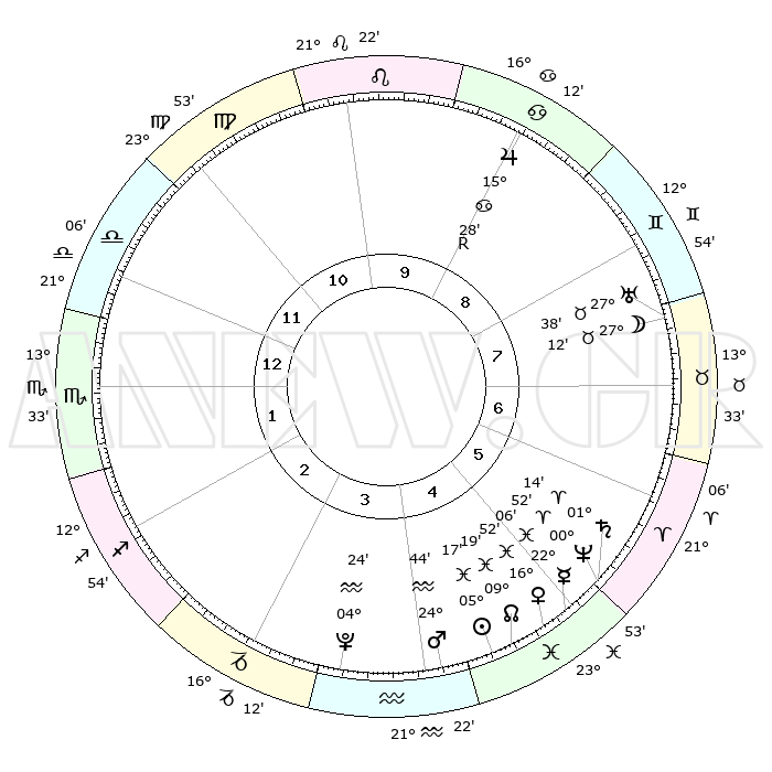 | | ΘΕΣΕΙΣ ΠΛΑΝΗΤΩΝ ΑΣΤΡΟΛΟΓΙΚΟΥ ΧΑΡΤΗ ΤΗΣ ΣΤΙΓΜΗΣ ΑΥΤΗΣ | | | | Πλανήτης | Ζώδιο | Μοίρες | Δεκαήμ. | Σε οίκο | Απόκλιση | | Ακμές των οίκων | | Ηλιος | Ιχθείς | 05°14' | Πρώτο | 4 | 09 S 35 | | 1ος | 28°26' | Ζυγός | | Σελήνη | Ταύρος | 26°27' | Τρίτο | 7 | 24 N 22 | | 2ος | 26°45' | Σκορπιός | | Ερμής | Ιχθείς | 22°05' | Τρίτο | 5 | 01 S 06 | | 3ος | 28°35' | Τοξότης | | Αφροδίτη | Ιχθείς | 16°48' | Δεύτερο | 5 | 06 S 31 | | 4ος | 02°40' | Υδροχόος | | Αρης | Υδροχόος | 24°42' | Τρίτο | 4 | 14 S 19 | | 5ος | 05°36' | Ιχθείς | | Δίας | Καρκίνος | 15°28'R | Δεύτερο | 9 | 22 N 52 | | 6ος | 04°25' | Κριός | | Κρόνος | Κριός | 01°14' | Πρώτο | 5 | 01 S 28 | | 7ος | 28°26' | Κριός | | Ουρανός | Ταύρος | 27°38' | Τρίτο | 8 | 19 N 27 | | 8ος | 26°45' | Ταύρος | | Ποσειδώνας | Κριός | 00°52' | Πρώτο | 5 | 00 S 51 | | 9ος | 28°35' | Δίδυμοι | | Πλούτωνας | Υδροχόος | 04°24' | Πρώτο | 4 | 22 S 54 | | 10ος | 02°40' | Λέων | | Β. Δεσμός | Ιχθείς | 09°19' | Πρώτο | 5 | 08 S 04 | | 11ος | 05°36' | Παρθένος | | Ωροσκόπος | Ζυγός | 28°26' | Τρίτο | | | 12ος | 04°25' | Ζυγός | | Μεσουράνημα | Λέων | 02°40' | Πρώτο | | | |
