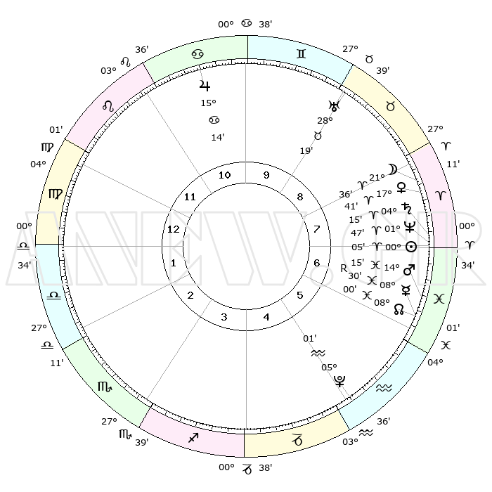 | | ΘΕΣΕΙΣ ΠΛΑΝΗΤΩΝ ΑΣΤΡΟΛΟΓΙΚΟΥ ΧΑΡΤΗ ΤΗΣ ΣΤΙΓΜΗΣ ΑΥΤΗΣ | | | | Πλανήτης | Ζώδιο | Μοίρες | Δεκαήμ. | Σε οίκο | Απόκλιση | | Ακμές των οίκων | | Ηλιος | Κριός | 00°01' | Πρώτο | 7 | 00 N 00 | | 1ος | 09°31' | Παρθένος | | Σελήνη | Κριός | 20°35' | Τρίτο | 8 | 11 N 16 | | 2ος | 04°20' | Ζυγός | | Ερμής | Ιχθείς | 08°30'R | Πρώτο | 6 | 07 S 25 | | 3ος | 03°45' | Σκορπιός | | Αφροδίτη | Κριός | 17°36' | Δεύτερο | 8 | 06 N 06 | | 4ος | 06°42' | Τοξότης | | Αρης | Ιχθείς | 14°12' | Δεύτερο | 7 | 07 S 12 | | 5ος | 10°19' | Αιγόκερως | | Δίας | Καρκίνος | 15°14' | Δεύτερο | 11 | 22 N 55 | | 6ος | 11°39' | Υδροχόος | | Κρόνος | Κριός | 04°15' | Πρώτο | 7 | 00 S 16 | | 7ος | 09°31' | Ιχθείς | | Ουρανός | Ταύρος | 28°18' | Τρίτο | 9 | 19 N 36 | | 8ος | 04°20' | Κριός | | Ποσειδώνας | Κριός | 01°47' | Πρώτο | 7 | 00 S 29 | | 9ος | 03°45' | Ταύρος | | Πλούτωνας | Υδροχόος | 05°00' | Πρώτο | 5 | 22 S 49 | | 10ος | 06°42' | Δίδυμοι | | Β. Δεσμός | Ιχθείς | 08°00' | Πρώτο | 6 | 08 S 34 | | 11ος | 10°19' | Καρκίνος | | Ωροσκόπος | Παρθένος | 09°31' | Πρώτο | | | 12ος | 11°39' | Λέων | | Μεσουράνημα | Δίδυμοι | 06°42' | Πρώτο | | | |