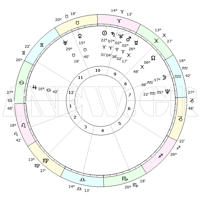 | | ΘΕΣΕΙΣ ΠΛΑΝΗΤΩΝ ΑΣΤΡΟΛΟΓΙΚΟΥ ΧΑΡΤΗ ΤΗΣ ΣΤΙΓΜΗΣ ΑΥΤΗΣ | | | | Πλανήτης | Ζώδιο | Μοίρες | Δεκαήμ. | Σε οίκο | Απόκλιση | | Ακμές των οίκων | | Ηλιος | Κριός | 22°27' | Τρίτο | 10 | 08 N 44 | | 1ος | 07°50' | Καρκίνος | | Σελήνη | Υδροχόος | 16°48' | Δεύτερο | 8 | 17 S 35 | | 2ος | 28°18' | Καρκίνος | | Ερμής | Ιχθείς | 26°12' | Τρίτο | 10 | 03 S 47 | | 3ος | 20°43' | Λέων | | Αφροδίτη | Ταύρος | 15°35' | Δεύτερο | 11 | 16 N 33 | | 4ος | 18°19' | Παρθένος | | Αρης | Κριός | 01°59' | Πρώτο | 10 | 00 S 08 | | 5ος | 23°22' | Ζυγός | | Δίας | Καρκίνος | 16°42' | Δεύτερο | 1 | 22 N 46 | | 6ος | 02°35' | Τοξότης | | Κρόνος | Κριός | 07°04' | Πρώτο | 10 | 00 N 50 | | 7ος | 07°50' | Αιγόκερως | | Ουρανός | Ταύρος | 29°18' | Τρίτο | 11 | 19 N 50 | | 8ος | 28°18' | Αιγόκερως | | Ποσειδώνας | Κριός | 02°38' | Πρώτο | 10 | 00 S 09 | | 9ος | 20°43' | Υδροχόος | | Πλούτωνας | Υδροχόος | 05°22' | Πρώτο | 8 | 22 S 47 | | 10ος | 18°19' | Ιχθείς | | Β. Δεσμός | Ιχθείς | 06°48' | Πρώτο | 9 | 09 S 01 | | 11ος | 23°22' | Κριός | | Ωροσκόπος | Καρκίνος | 07°50' | Πρώτο | | | 12ος | 02°35' | Δίδυμοι | | Μεσουράνημα | Ιχθείς | 18°19' | Δεύτερο | | | |