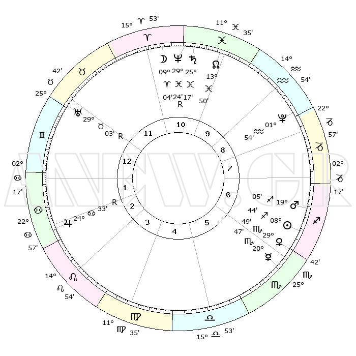 | | ΘΕΣΕΙΣ ΠΛΑΝΗΤΩΝ ΑΣΤΡΟΛΟΓΙΚΟΥ ΧΑΡΤΗ ΤΗΣ ΣΤΙΓΜΗΣ ΑΥΤΗΣ | | | | Πλανήτης | Ζώδιο | Μοίρες | Δεκαήμ. | Σε οίκο | Απόκλιση | | Ακμές των οίκων | | Ηλιος | Τοξότης | 08°41' | Πρώτο | 6 | 21 S 45 | | 1ος | 18°44' | Δίδυμοι | | Σελήνη | Κριός | 08°30' | Πρώτο | 11 | 05 N 16 | | 2ος | 10°32' | Καρκίνος | | Ερμής | Σκορπιός | 20°47' | Τρίτο | 6 | 15 S 27 | | 3ος | 01°49' | Λέων | | Αφροδίτη | Σκορπιός | 29°46' | Τρίτο | 6 | 19 S 24 | | 4ος | 26°30' | Λέων | | Αρης | Τοξότης | 19°03' | Δεύτερο | 7 | 23 S 38 | | 5ος | 28°26' | Παρθένος | | Δίας | Καρκίνος | 24°33'R | Τρίτο | 2 | 21 N 22 | | 6ος | 08°42' | Σκορπιός | | Κρόνος | Ιχθείς | 25°17' | Τρίτο | 10 | 04 S 03 | | 7ος | 18°44' | Τοξότης | | Ουρανός | Ταύρος | 29°04'R | Τρίτο | 12 | 19 N 45 | | 8ος | 10°31' | Αιγόκερως | | Ποσειδώνας | Ιχθείς | 29°24'R | Τρίτο | 11 | 01 S 29 | | 9ος | 01°49' | Υδροχόος | | Πλούτωνας | Υδροχόος | 01°54' | Πρώτο | 9 | 23 S 24 | | 10ος | 26°30' | Υδροχόος | | Β. Δεσμός | Ιχθείς | 13°50' | Δεύτερο | 10 | 06 S 22 | | 11ος | 28°26' | Ιχθείς | | Ωροσκόπος | Δίδυμοι | 18°44' | Δεύτερο | | | 12ος | 08°42' | Ταύρος | | Μεσουράνημα | Υδροχόος | 26°30' | Τρίτο | | | |