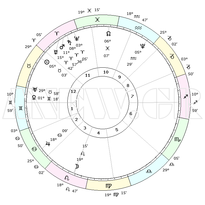 | | ΘΕΣΕΙΣ ΠΛΑΝΗΤΩΝ ΑΣΤΡΟΛΟΓΙΚΟΥ ΧΑΡΤΗ ΤΗΣ ΣΤΙΓΜΗΣ ΑΥΤΗΣ | | | | Πλανήτης | Ζώδιο | Μοίρες | Δεκαήμ. | Σε οίκο | Απόκλιση | | Ακμές των οίκων | | Ηλιος | Ταύρος | 04°59' | Πρώτο | 12 | 13 N 11 | | 1ος | 12°09' | Ταύρος | | Σελήνη | Λέων | 18°22' | Δεύτερο | 4 | 16 N 54 | | 2ος | 11°06' | Δίδυμοι | | Ερμής | Κριός | 15°36' | Δεύτερο | 12 | 03 N 54 | | 3ος | 03°34' | Καρκίνος | | Αφροδίτη | Δίδυμοι | 01°13' | Πρώτο | 1 | 21 N 01 | | 4ος | 25°26' | Καρκίνος | | Αρης | Κριός | 11°54' | Δεύτερο | 12 | 03 N 51 | | 5ος | 21°13' | Λέων | | Δίας | Καρκίνος | 18°08' | Δεύτερο | 3 | 22 N 35 | | 6ος | 26°22' | Παρθένος | | Κρόνος | Κριός | 08°36' | Πρώτο | 12 | 01 N 25 | | 7ος | 12°09' | Σκορπιός | | Ουρανός | Ταύρος | 29°57' | Τρίτο | 1 | 19 N 58 | | 8ος | 11°06' | Τοξότης | | Ποσειδώνας | Κριός | 03°05' | Πρώτο | 12 | 00 N 01 | | 9ος | 03°34' | Αιγόκερως | | Πλούτωνας | Υδροχόος | 05°29' | Πρώτο | 10 | 22 S 48 | | 10ος | 25°26' | Αιγόκερως | | Β. Δεσμός | Ιχθείς | 06°07' | Πρώτο | 11 | 09 S 16 | | 11ος | 21°13' | Υδροχόος | | Ωροσκόπος | Ταύρος | 12°09' | Δεύτερο | | | 12ος | 26°22' | Ιχθείς | | Μεσουράνημα | Αιγόκερως | 25°26' | Τρίτο | | | |
