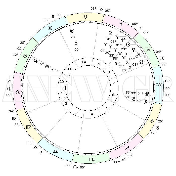 | | ΘΕΣΕΙΣ ΠΛΑΝΗΤΩΝ ΑΣΤΡΟΛΟΓΙΚΟΥ ΧΑΡΤΗ ΤΗΣ ΣΤΙΓΜΗΣ ΑΥΤΗΣ | | | | Πλανήτης | Ζώδιο | Μοίρες | Δεκαήμ. | Σε οίκο | Απόκλιση | | Ακμές των οίκων | | Ηλιος | Ιχθείς | 23°54' | Τρίτο | 9 | 02 S 25 | | 1ος | 24°19' | Καρκίνος | | Σελήνη | Αιγόκερως | 28°05' | Τρίτο | 7 | 23 S 55 | | 2ος | 15°02' | Λέων | | Ερμής | Ιχθείς | 10°34'R | Δεύτερο | 9 | 05 S 15 | | 3ος | 09°19' | Παρθένος | | Αφροδίτη | Κριός | 09°60' | Πρώτο | 10 | 02 N 59 | | 4ος | 09°35' | Ζυγός | | Αρης | Ιχθείς | 09°22' | Πρώτο | 9 | 09 S 04 | | 5ος | 15°41' | Σκορπιός | | Δίας | Καρκίνος | 15°06' | Δεύτερο | 12 | 22 N 56 | | 6ος | 22°20' | Τοξότης | | Κρόνος | Κριός | 03°29' | Πρώτο | 9 | 00 S 34 | | 7ος | 24°19' | Αιγόκερως | | Ουρανός | Ταύρος | 28°06' | Τρίτο | 11 | 19 N 34 | | 8ος | 15°02' | Υδροχόος | | Ποσειδώνας | Κριός | 01°33' | Πρώτο | 9 | 00 S 35 | | 9ος | 09°19' | Ιχθείς | | Πλούτωνας | Υδροχόος | 04°52' | Πρώτο | 7 | 22 S 50 | | 10ος | 09°35' | Κριός | | Β. Δεσμός | Ιχθείς | 08°20' | Πρώτο | 8 | 08 S 27 | | 11ος | 15°41' | Ταύρος | | Ωροσκόπος | Καρκίνος | 24°19' | Τρίτο | | | 12ος | 22°20' | Δίδυμοι | | Μεσουράνημα | Κριός | 09°35' | Πρώτο | | | |