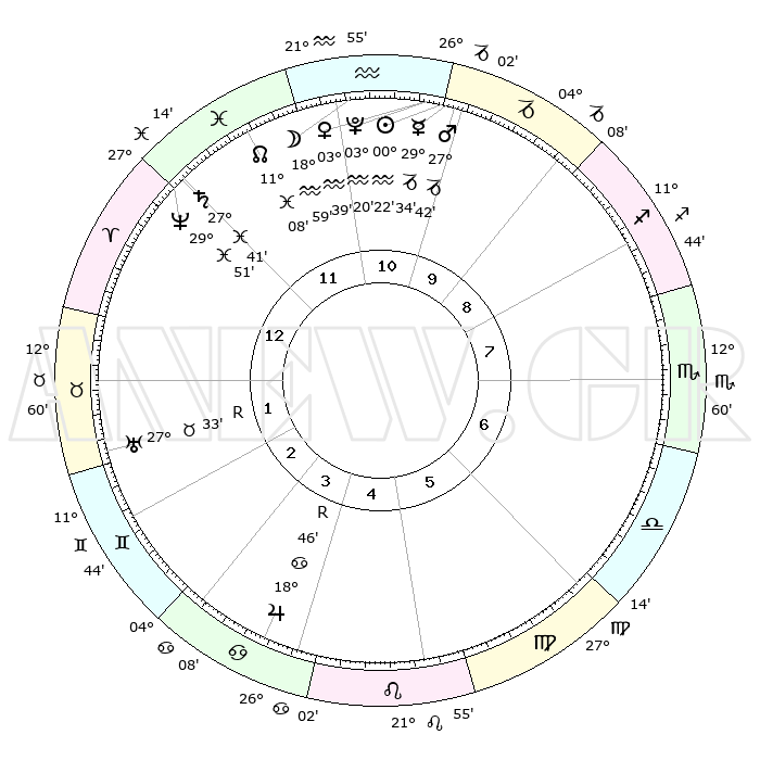 | | ΘΕΣΕΙΣ ΠΛΑΝΗΤΩΝ ΑΣΤΡΟΛΟΓΙΚΟΥ ΧΑΡΤΗ ΤΗΣ ΣΤΙΓΜΗΣ ΑΥΤΗΣ | | | | Πλανήτης | Ζώδιο | Μοίρες | Δεκαήμ. | Σε οίκο | Απόκλιση | | Ακμές των οίκων | | Ηλιος | Υδροχόος | 00°16' | Πρώτο | 11 | 20 S 05 | | 1ος | 20°06' | Ιχθείς | | Σελήνη | Υδροχόος | 17°47' | Δεύτερο | 12 | 17 S 19 | | 2ος | 02°36' | Ταύρος | | Ερμής | Αιγόκερως | 29°25' | Τρίτο | 11 | 22 S 15 | | 3ος | 01°36' | Δίδυμοι | | Αφροδίτη | Υδροχόος | 03°32' | Πρώτο | 11 | 20 S 27 | | 4ος | 24°26' | Δίδυμοι | | Αρης | Αιγόκερως | 27°38' | Τρίτο | 11 | 21 S 36 | | 5ος | 16°22' | Καρκίνος | | Δίας | Καρκίνος | 18°46'R | Δεύτερο | 5 | 22 N 24 | | 6ος | 12°20' | Λέων | | Κρόνος | Ιχθείς | 27°41' | Τρίτο | 1 | 02 S 57 | | 7ος | 20°06' | Παρθένος | | Ουρανός | Ταύρος | 27°33'R | Τρίτο | 2 | 19 N 25 | | 8ος | 02°36' | Σκορπιός | | Ποσειδώνας | Ιχθείς | 29°51' | Τρίτο | 1 | 01 S 16 | | 9ος | 01°36' | Τοξότης | | Πλούτωνας | Υδροχόος | 03°20' | Πρώτο | 11 | 23 S 06 | | 10ος | 24°26' | Τοξότης | | Β. Δεσμός | Ιχθείς | 11°09' | Δεύτερο | 12 | 07 S 23 | | 11ος | 16°22' | Αιγόκερως | | Ωροσκόπος | Ιχθείς | 20°06' | Τρίτο | | | 12ος | 12°20' | Υδροχόος | | Μεσουράνημα | Τοξότης | 24°26' | Τρίτο | | | |