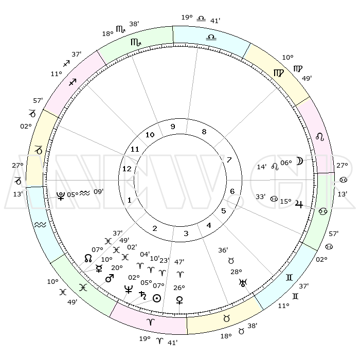 | | ΘΕΣΕΙΣ ΠΛΑΝΗΤΩΝ ΑΣΤΡΟΛΟΓΙΚΟΥ ΧΑΡΤΗ ΤΗΣ ΣΤΙΓΜΗΣ ΑΥΤΗΣ | | | | Πλανήτης | Ζώδιο | Μοίρες | Δεκαήμ. | Σε οίκο | Απόκλιση | | Ακμές των οίκων | | Ηλιος | Κριός | 07°19' | Πρώτο | 3 | 02 N 54 | | 1ος | 07°12' | Αιγόκερως | | Σελήνη | Λέων | 05°31' | Πρώτο | 7 | 21 N 40 | | 2ος | 16°11' | Υδροχόος | | Ερμής | Ιχθείς | 10°47' | Δεύτερο | 2 | 08 S 05 | | 3ος | 26°29' | Ιχθείς | | Αφροδίτη | Κριός | 26°43' | Τρίτο | 3 | 09 N 44 | | 4ος | 29°11' | Κριός | | Αρης | Ιχθείς | 19°59' | Δεύτερο | 2 | 04 S 56 | | 5ος | 24°25' | Ταύρος | | Δίας | Καρκίνος | 15°33' | Δεύτερο | 7 | 22 N 54 | | 6ος | 15°50' | Δίδυμοι | | Κρόνος | Κριός | 05°10' | Πρώτο | 3 | 00 N 06 | | 7ος | 07°12' | Καρκίνος | | Ουρανός | Ταύρος | 28°36' | Τρίτο | 5 | 19 N 40 | | 8ος | 16°11' | Λέων | | Ποσειδώνας | Κριός | 02°04' | Πρώτο | 3 | 00 S 23 | | 9ος | 26°29' | Παρθένος | | Πλούτωνας | Υδροχόος | 05°09' | Πρώτο | 1 | 22 S 48 | | 10ος | 29°11' | Ζυγός | | Β. Δεσμός | Ιχθείς | 07°37' | Πρώτο | 2 | 08 S 43 | | 11ος | 24°25' | Σκορπιός | | Ωροσκόπος | Αιγόκερως | 07°12' | Πρώτο | | | 12ος | 15°50' | Τοξότης | | Μεσουράνημα | Ζυγός | 29°11' | Τρίτο | | | |