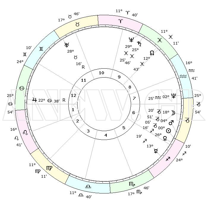 | | ΘΕΣΕΙΣ ΠΛΑΝΗΤΩΝ ΑΣΤΡΟΛΟΓΙΚΟΥ ΧΑΡΤΗ ΤΗΣ ΣΤΙΓΜΗΣ ΑΥΤΗΣ | | | | Πλανήτης | Ζώδιο | Μοίρες | Δεκαήμ. | Σε οίκο | Απόκλιση | | Ακμές των οίκων | | Ηλιος | Αιγόκερως | 00°01' | Πρώτο | 6 | 23 S 26 | | 1ος | 04°26' | Καρκίνος | | Σελήνη | Αιγόκερως | 17°28' | Δεύτερο | 7 | 26 S 20 | | 2ος | 25°00' | Καρκίνος | | Ερμής | Τοξότης | 13°13' | Δεύτερο | 6 | 21 S 42 | | 3ος | 17°08' | Λέων | | Αφροδίτη | Τοξότης | 26°11' | Τρίτο | 6 | 23 S 29 | | 4ος | 14°10' | Παρθένος | | Αρης | Αιγόκερως | 04°48' | Πρώτο | 7 | 24 S 10 | | 5ος | 18°46' | Ζυγός | | Δίας | Καρκίνος | 22°38'R | Τρίτο | 1 | 21 N 45 | | 6ος | 28°23' | Σκορπιός | | Κρόνος | Ιχθείς | 25°46' | Τρίτο | 10 | 03 S 47 | | 7ος | 04°26' | Αιγόκερως | | Ουρανός | Ταύρος | 28°16'R | Τρίτο | 11 | 19 N 34 | | 8ος | 25°00' | Αιγόκερως | | Ποσειδώνας | Ιχθείς | 29°25' | Τρίτο | 10 | 01 S 28 | | 9ος | 17°08' | Υδροχόος | | Πλούτωνας | Υδροχόος | 02°25' | Πρώτο | 8 | 23 S 17 | | 10ος | 14°10' | Ιχθείς | | Β. Δεσμός | Ιχθείς | 12°43' | Δεύτερο | 9 | 06 S 47 | | 11ος | 18°46' | Κριός | | Ωροσκόπος | Καρκίνος | 04°26' | Πρώτο | | | 12ος | 28°23' | Ταύρος | | Μεσουράνημα | Ιχθείς | 14°10' | Δεύτερο | | | |