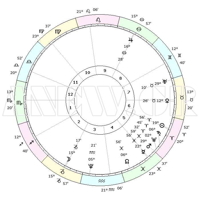 | | ΘΕΣΕΙΣ ΠΛΑΝΗΤΩΝ ΑΣΤΡΟΛΟΓΙΚΟΥ ΧΑΡΤΗ ΤΗΣ ΣΤΙΓΜΗΣ ΑΥΤΗΣ | | | | Πλανήτης | Ζώδιο | Μοίρες | Δεκαήμ. | Σε οίκο | Απόκλιση | | Ακμές των οίκων | | Ηλιος | Κριός | 19°52' | Δεύτερο | 6 | 07 N 46 | | 1ος | 21°56' | Ζυγός | | Σελήνη | Αιγόκερως | 14°24' | Δεύτερο | 3 | 26 S 48 | | 2ος | 19°53' | Σκορπιός | | Ερμής | Ιχθείς | 22°51' | Τρίτο | 5 | 04 S 58 | | 3ος | 21°17' | Τοξότης | | Αφροδίτη | Ταύρος | 12°21' | Δεύτερο | 7 | 15 N 28 | | 4ος | 24°58' | Αιγόκερως | | Αρης | Ιχθείς | 29°56' | Τρίτο | 6 | 00 S 57 | | 5ος | 27°56' | Υδροχόος | | Δίας | Καρκίνος | 16°27' | Δεύτερο | 9 | 22 N 48 | | 6ος | 27°15' | Ιχθείς | | Κρόνος | Κριός | 06°44' | Πρώτο | 6 | 00 N 43 | | 7ος | 21°56' | Κριός | | Ουρανός | Ταύρος | 29°10' | Τρίτο | 8 | 19 N 48 | | 8ος | 19°53' | Ταύρος | | Ποσειδώνας | Κριός | 02°32' | Πρώτο | 6 | 00 S 12 | | 9ος | 21°17' | Δίδυμοι | | Πλούτωνας | Υδροχόος | 05°20' | Πρώτο | 4 | 22 S 47 | | 10ος | 24°58' | Καρκίνος | | Β. Δεσμός | Ιχθείς | 06°57' | Πρώτο | 5 | 08 S 58 | | 11ος | 27°56' | Λέων | | Ωροσκόπος | Ζυγός | 21°56' | Τρίτο | | | 12ος | 27°15' | Παρθένος | | Μεσουράνημα | Καρκίνος | 24°58' | Τρίτο | | | |