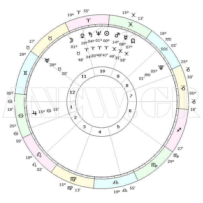 | | ΘΕΣΕΙΣ ΠΛΑΝΗΤΩΝ ΑΣΤΡΟΛΟΓΙΚΟΥ ΧΑΡΤΗ ΤΗΣ ΣΤΙΓΜΗΣ ΑΥΤΗΣ | | | | Πλανήτης | Ζώδιο | Μοίρες | Δεκαήμ. | Σε οίκο | Απόκλιση | | Ακμές των οίκων | | Ηλιος | Κριός | 00°41' | Πρώτο | 11 | 00 N 16 | | 1ος | 27°45' | Ταύρος | | Σελήνη | Ταύρος | 00°20' | Πρώτο | 12 | 15 N 26 | | 2ος | 23°01' | Δίδυμοι | | Ερμής | Ιχθείς | 08°30' | Πρώτο | 11 | 07 S 34 | | 3ος | 14°32' | Καρκίνος | | Αφροδίτη | Κριός | 18°26' | Δεύτερο | 12 | 06 N 27 | | 4ος | 07°08' | Λέων | | Αρης | Ιχθείς | 14°44' | Δεύτερο | 11 | 07 S 00 | | 5ος | 05°13' | Παρθένος | | Δίας | Καρκίνος | 15°15' | Δεύτερο | 3 | 22 N 55 | | 6ος | 13°18' | Ζυγός | | Κρόνος | Κριός | 04°20' | Πρώτο | 11 | 00 S 14 | | 7ος | 27°45' | Σκορπιός | | Ουρανός | Ταύρος | 28°20' | Τρίτο | 1 | 19 N 37 | | 8ος | 23°01' | Τοξότης | | Ποσειδώνας | Κριός | 01°48' | Πρώτο | 11 | 00 S 29 | | 9ος | 14°32' | Αιγόκερως | | Πλούτωνας | Υδροχόος | 05°01' | Πρώτο | 9 | 22 S 48 | | 10ος | 07°08' | Υδροχόος | | Β. Δεσμός | Ιχθείς | 07°58' | Πρώτο | 11 | 08 S 35 | | 11ος | 05°13' | Ιχθείς | | Ωροσκόπος | Ταύρος | 27°45' | Τρίτο | | | 12ος | 13°18' | Κριός | | Μεσουράνημα | Υδροχόος | 07°08' | Πρώτο | | | |