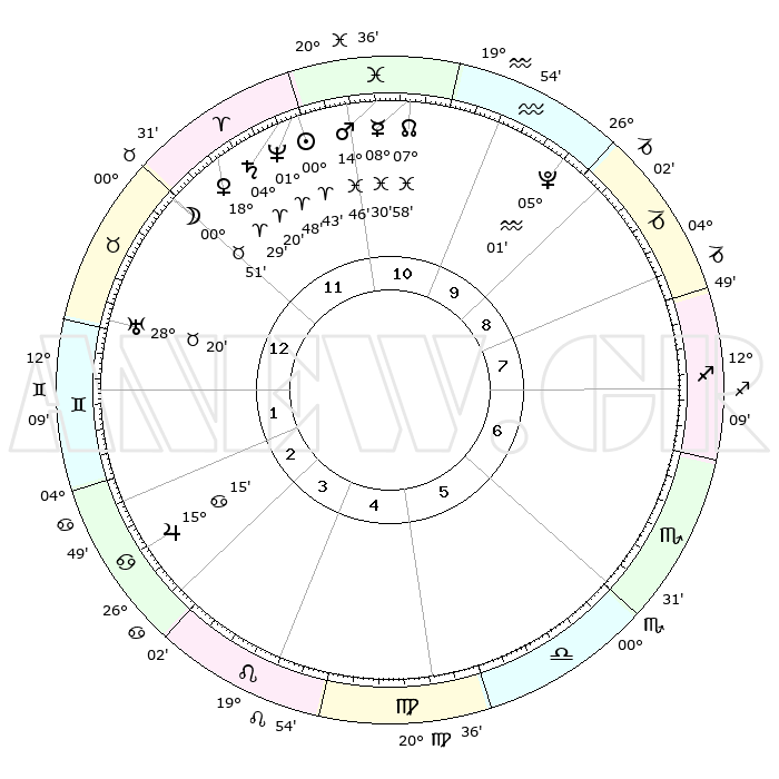 | | ΘΕΣΕΙΣ ΠΛΑΝΗΤΩΝ ΑΣΤΡΟΛΟΓΙΚΟΥ ΧΑΡΤΗ ΤΗΣ ΣΤΙΓΜΗΣ ΑΥΤΗΣ | | | | Πλανήτης | Ζώδιο | Μοίρες | Δεκαήμ. | Σε οίκο | Απόκλιση | | Ακμές των οίκων | | Ηλιος | Κριός | 00°39' | Πρώτο | 12 | 00 N 15 | | 1ος | 10°54' | Ταύρος | | Σελήνη | Κριός | 29°49' | Τρίτο | 12 | 15 N 13 | | 2ος | 10°11' | Δίδυμοι | | Ερμής | Ιχθείς | 08°30' | Πρώτο | 11 | 07 S 34 | | 3ος | 02°44' | Καρκίνος | | Αφροδίτη | Κριός | 18°24' | Δεύτερο | 12 | 06 N 25 | | 4ος | 24°35' | Καρκίνος | | Αρης | Ιχθείς | 14°42' | Δεύτερο | 11 | 07 S 01 | | 5ος | 20°12' | Λέων | | Δίας | Καρκίνος | 15°15' | Δεύτερο | 3 | 22 N 55 | | 6ος | 25°05' | Παρθένος | | Κρόνος | Κριός | 04°19' | Πρώτο | 12 | 00 S 14 | | 7ος | 10°54' | Σκορπιός | | Ουρανός | Ταύρος | 28°20' | Τρίτο | 1 | 19 N 37 | | 8ος | 10°11' | Τοξότης | | Ποσειδώνας | Κριός | 01°48' | Πρώτο | 12 | 00 S 29 | | 9ος | 02°44' | Αιγόκερως | | Πλούτωνας | Υδροχόος | 05°01' | Πρώτο | 10 | 22 S 48 | | 10ος | 24°35' | Αιγόκερως | | Β. Δεσμός | Ιχθείς | 07°58' | Πρώτο | 11 | 08 S 35 | | 11ος | 20°12' | Υδροχόος | | Ωροσκόπος | Ταύρος | 10°54' | Δεύτερο | | | 12ος | 25°05' | Ιχθείς | | Μεσουράνημα | Αιγόκερως | 24°35' | Τρίτο | | | |
