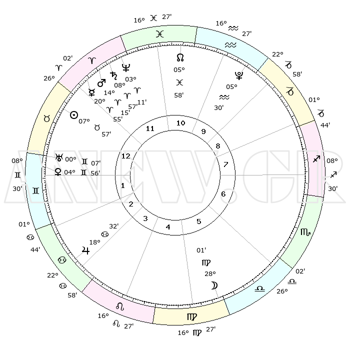 | | ΘΕΣΕΙΣ ΠΛΑΝΗΤΩΝ ΑΣΤΡΟΛΟΓΙΚΟΥ ΧΑΡΤΗ ΤΗΣ ΣΤΙΓΜΗΣ ΑΥΤΗΣ | | | | Πλανήτης | Ζώδιο | Μοίρες | Δεκαήμ. | Σε οίκο | Απόκλιση | | Ακμές των οίκων | | Ηλιος | Ταύρος | 07°53' | Πρώτο | 12 | 14 N 08 | | 1ος | 11°23' | Ταύρος | | Σελήνη | Παρθένος | 27°14' | Τρίτο | 6 | 00 S 30 | | 2ος | 10°33' | Δίδυμοι | | Ερμής | Κριός | 20°48' | Τρίτο | 12 | 06 N 05 | | 3ος | 03°03' | Καρκίνος | | Αφροδίτη | Δίδυμοι | 04°51' | Πρώτο | 1 | 21 N 52 | | 4ος | 24°55' | Καρκίνος | | Αρης | Κριός | 14°12' | Δεύτερο | 12 | 04 N 46 | | 5ος | 20°35' | Λέων | | Δίας | Καρκίνος | 18°32' | Δεύτερο | 3 | 22 N 32 | | 6ος | 25°35' | Παρθένος | | Κρόνος | Κριός | 08°56' | Πρώτο | 12 | 01 N 33 | | 7ος | 11°23' | Σκορπιός | | Ουρανός | Δίδυμοι | 00°07' | Πρώτο | 1 | 20 N 01 | | 8ος | 10°33' | Τοξότης | | Ποσειδώνας | Κριός | 03°10' | Πρώτο | 12 | 00 N 03 | | 9ος | 03°03' | Αιγόκερως | | Πλούτωνας | Υδροχόος | 05°29' | Πρώτο | 10 | 22 S 48 | | 10ος | 24°55' | Αιγόκερως | | Β. Δεσμός | Ιχθείς | 05°58' | Πρώτο | 11 | 09 S 19 | | 11ος | 20°35' | Υδροχόος | | Ωροσκόπος | Ταύρος | 11°23' | Δεύτερο | | | 12ος | 25°35' | Ιχθείς | | Μεσουράνημα | Αιγόκερως | 24°55' | Τρίτο | | | |