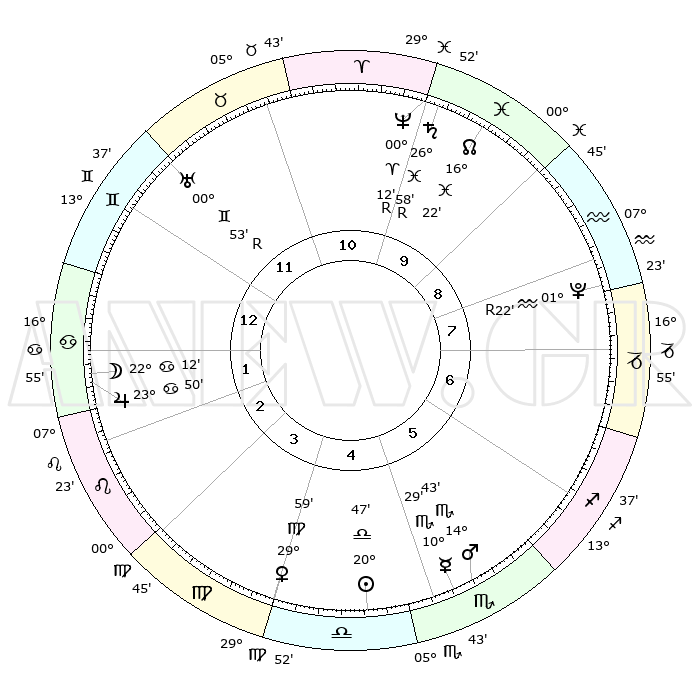 | ΘΕΣΕΙΣ ΠΛΑΝΗΤΩΝ ΑΣΤΡΟΛΟΓΙΚΟΥ ΧΑΡΤΗ ΤΗΣ ΣΤΙΓΜΗΣ ΑΥΤΗΣ | | Πλανήτης | Ζώδιο | Μοίρες | Δεκαήμ. | Σε οίκο | Απόκλιση | | Ακμές των οίκων | Ηλιος | Ζυγός | 20°40' | Τρίτο | 5 | 08 S 04 | | 1ος | 12°38' | Δίδυμοι | Σελήνη | Καρκίνος | 20°48' | Τρίτο | 2 | 26 N 09 | | 2ος | 05°14' | Καρκίνος | Ερμής | Σκορπιός | 10°21' | Δεύτερο | 6 | 16 S 26 | | 3ος | 26°27' | Καρκίνος | Αφροδίτη | Παρθένος | 29°52' | Τρίτο | 5 | 01 N 26 | | 4ος | 20°23' | Λέων | Αρης | Σκορπιός | 14°39' | Δεύτερο | 6 | 16 S 26 | | 5ος | 21°09' | Παρθένος | Δίας | Καρκίνος | 23°49' | Τρίτο | 2 | 21 N 23 | | 6ος | 01°07' | Σκορπιός | Κρόνος | Ιχθείς | 26°58'R | Τρίτο | 11 | 03 S 30 | | 7ος | 12°38' | Τοξότης | Ουρανός | Δίδυμοι | 00°53'R | Πρώτο | 12 | 20 N 08 | | 8ος | 05°14' | Αιγόκερως | Ποσειδώνας | Κριός | 00°12'R | Πρώτο | 11 | 01 S 11 | | 9ος | 26°27' | Αιγόκερως | Πλούτωνας | Υδροχόος | 01°22'R | Πρώτο | 9 | 23 S 32 | | 10ος | 20°23' | Υδροχόος | Β. Δεσμός | Ιχθείς | 16°22' | Δεύτερο | 10 | 05 S 23 | | 11ος | 21°09' | Ιχθείς | Ωροσκόπος | Δίδυμοι | 12°38' | Δεύτερο | | | 12ος | 01°07' | Ταύρος | Μεσουράνημα | Υδροχόος | 20°23' | Τρίτο | | | |
