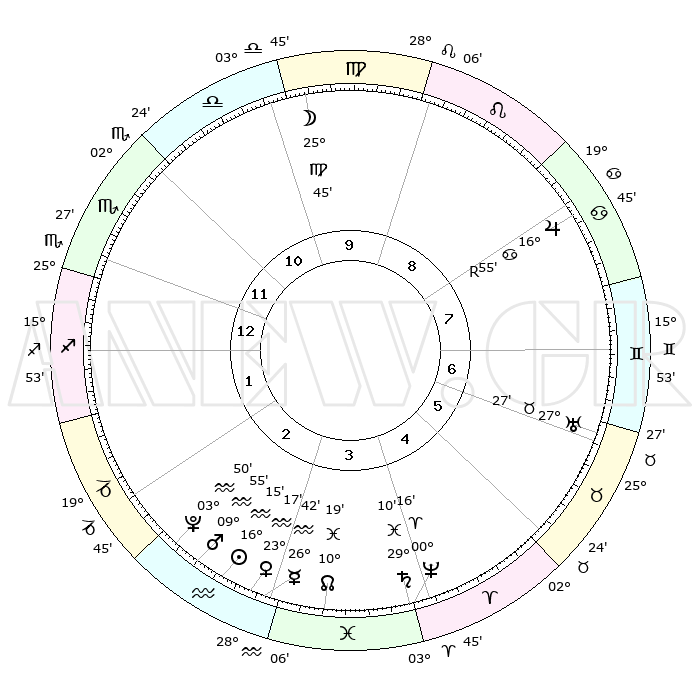 | | ΘΕΣΕΙΣ ΠΛΑΝΗΤΩΝ ΑΣΤΡΟΛΟΓΙΚΟΥ ΧΑΡΤΗ ΤΗΣ ΣΤΙΓΜΗΣ ΑΥΤΗΣ | | | | Πλανήτης | Ζώδιο | Μοίρες | Δεκαήμ. | Σε οίκο | Απόκλιση | | Ακμές των οίκων | | Ηλιος | Υδροχόος | 16°11' | Δεύτερο | 3 | 15 S 59 | | 1ος | 23°15' | Σκορπιός | | Σελήνη | Παρθένος | 24°45' | Τρίτο | 10 | 00 N 47 | | 2ος | 23°33' | Τοξότης | | Ερμής | Υδροχόος | 26°33' | Τρίτο | 3 | 14 S 08 | | 3ος | 28°11' | Αιγόκερως | | Αφροδίτη | Υδροχόος | 23°12' | Τρίτο | 3 | 15 S 07 | | 4ος | 03°58' | Ιχθείς | | Αρης | Υδροχόος | 09°52' | Πρώτο | 3 | 18 S 47 | | 5ος | 05°45' | Κριός | | Δίας | Καρκίνος | 16°56'R | Δεύτερο | 8 | 22 N 40 | | 6ος | 01°43' | Ταύρος | | Κρόνος | Ιχθείς | 29°09' | Τρίτο | 4 | 02 S 19 | | 7ος | 23°15' | Ταύρος | | Ουρανός | Ταύρος | 27°27' | Τρίτο | 7 | 19 N 24 | | 8ος | 23°33' | Δίδυμοι | | Ποσειδώνας | Κριός | 00°15' | Πρώτο | 4 | 01 S 06 | | 9ος | 28°11' | Καρκίνος | | Πλούτωνας | Υδροχόος | 03°50' | Πρώτο | 3 | 23 S 00 | | 10ος | 03°58' | Παρθένος | | Β. Δεσμός | Ιχθείς | 10°19' | Δεύτερο | 4 | 07 S 42 | | 11ος | 05°45' | Ζυγός | | Ωροσκόπος | Σκορπιός | 23°15' | Τρίτο | | | 12ος | 01°43' | Σκορπιός | | Μεσουράνημα | Παρθένος | 03°58' | Πρώτο | | | |