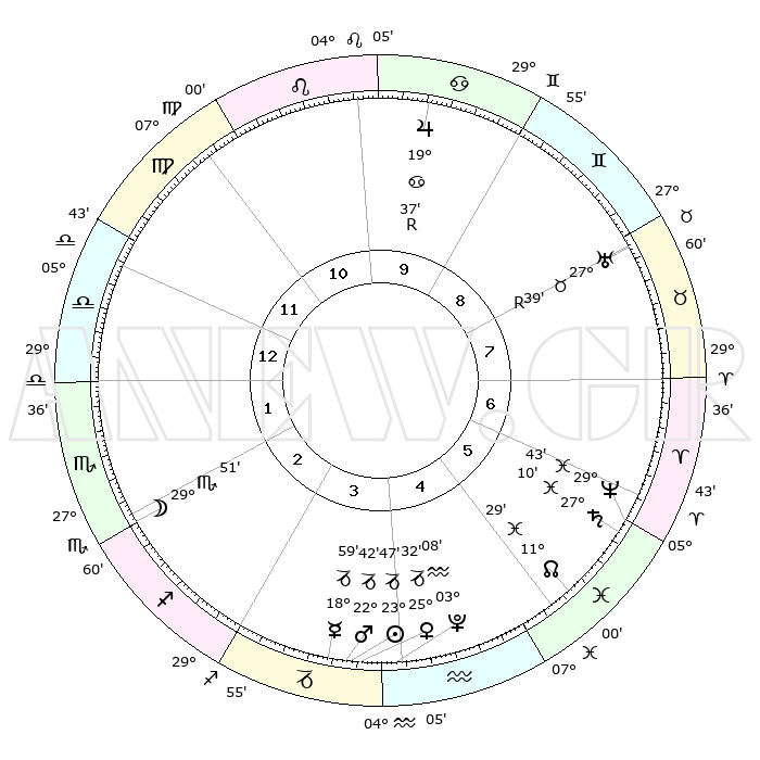 | | ΘΕΣΕΙΣ ΠΛΑΝΗΤΩΝ ΑΣΤΡΟΛΟΓΙΚΟΥ ΧΑΡΤΗ ΤΗΣ ΣΤΙΓΜΗΣ ΑΥΤΗΣ | | | | Πλανήτης | Ζώδιο | Μοίρες | Δεκαήμ. | Σε οίκο | Απόκλιση | | Ακμές των οίκων | | Ηλιος | Αιγόκερως | 23°43' | Τρίτο | 4 | 21 S 21 | | 1ος | 08°51' | Ζυγός | | Σελήνη | Σκορπιός | 29°01' | Τρίτο | 2 | 24 S 50 | | 2ος | 06°02' | Σκορπιός | | Ερμής | Αιγόκερως | 18°52' | Δεύτερο | 4 | 23 S 48 | | 3ος | 06°49' | Τοξότης | | Αφροδίτη | Αιγόκερως | 25°27' | Τρίτο | 4 | 21 S 59 | | 4ος | 09°58' | Αιγόκερως | | Αρης | Αιγόκερως | 22°38' | Τρίτο | 4 | 22 S 29 | | 5ος | 12°53' | Υδροχόος | | Δίας | Καρκίνος | 19°38'R | Δεύτερο | 10 | 22 N 16 | | 6ος | 12°57' | Ιχθείς | | Κρόνος | Ιχθείς | 27°10' | Τρίτο | 6 | 03 S 10 | | 7ος | 08°51' | Κριός | | Ουρανός | Ταύρος | 27°39'R | Τρίτο | 8 | 19 N 26 | | 8ος | 06°02' | Ταύρος | | Ποσειδώνας | Ιχθείς | 29°43' | Τρίτο | 6 | 01 S 20 | | 9ος | 06°49' | Δίδυμοι | | Πλούτωνας | Υδροχόος | 03°07' | Πρώτο | 4 | 23 S 08 | | 10ος | 09°58' | Καρκίνος | | Β. Δεσμός | Ιχθείς | 11°29' | Δεύτερο | 5 | 07 S 15 | | 11ος | 12°53' | Λέων | | Ωροσκόπος | Ζυγός | 08°51' | Πρώτο | | | 12ος | 12°57' | Παρθένος | | Μεσουράνημα | Καρκίνος | 09°58' | Πρώτο | | | |