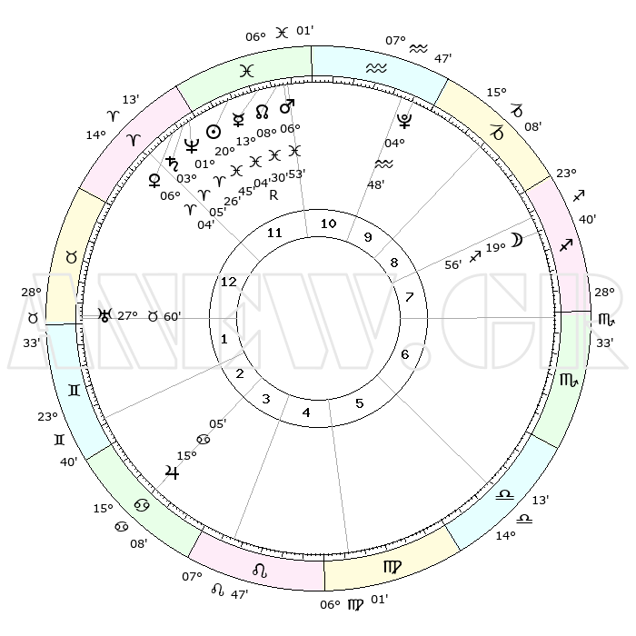 | | ΘΕΣΕΙΣ ΠΛΑΝΗΤΩΝ ΑΣΤΡΟΛΟΓΙΚΟΥ ΧΑΡΤΗ ΤΗΣ ΣΤΙΓΜΗΣ ΑΥΤΗΣ | | | | Πλανήτης | Ζώδιο | Μοίρες | Δεκαήμ. | Σε οίκο | Απόκλιση | | Ακμές των οίκων | | Ηλιος | Ιχθείς | 20°41' | Τρίτο | 12 | 03 S 41 | | 1ος | 27°42' | Κριός | | Σελήνη | Τοξότης | 19°11' | Δεύτερο | 8 | 28 S 10 | | 2ος | 00°33' | Δίδυμοι | | Ερμής | Ιχθείς | 13°07'R | Δεύτερο | 12 | 03 S 41 | | 3ος | 24°21' | Δίδυμοι | | Αφροδίτη | Κριός | 05°60' | Πρώτο | 12 | 01 N 20 | | 4ος | 16°02' | Καρκίνος | | Αρης | Ιχθείς | 06°50' | Πρώτο | 11 | 10 S 01 | | 5ος | 10°13' | Λέων | | Δίας | Καρκίνος | 15°05' | Δεύτερο | 3 | 22 N 56 | | 6ος | 12°28' | Παρθένος | | Κρόνος | Κριός | 03°05' | Πρώτο | 12 | 00 S 44 | | 7ος | 27°42' | Ζυγός | | Ουρανός | Ταύρος | 27°60' | Τρίτο | 1 | 19 N 32 | | 8ος | 00°33' | Τοξότης | | Ποσειδώνας | Κριός | 01°26' | Πρώτο | 12 | 00 S 38 | | 9ος | 24°21' | Τοξότης | | Πλούτωνας | Υδροχόος | 04°48' | Πρώτο | 10 | 22 S 50 | | 10ος | 16°02' | Αιγόκερως | | Β. Δεσμός | Ιχθείς | 08°30' | Πρώτο | 11 | 08 S 23 | | 11ος | 10°13' | Υδροχόος | | Ωροσκόπος | Κριός | 27°42' | Τρίτο | | | 12ος | 12°28' | Ιχθείς | | Μεσουράνημα | Αιγόκερως | 16°02' | Δεύτερο | | | |