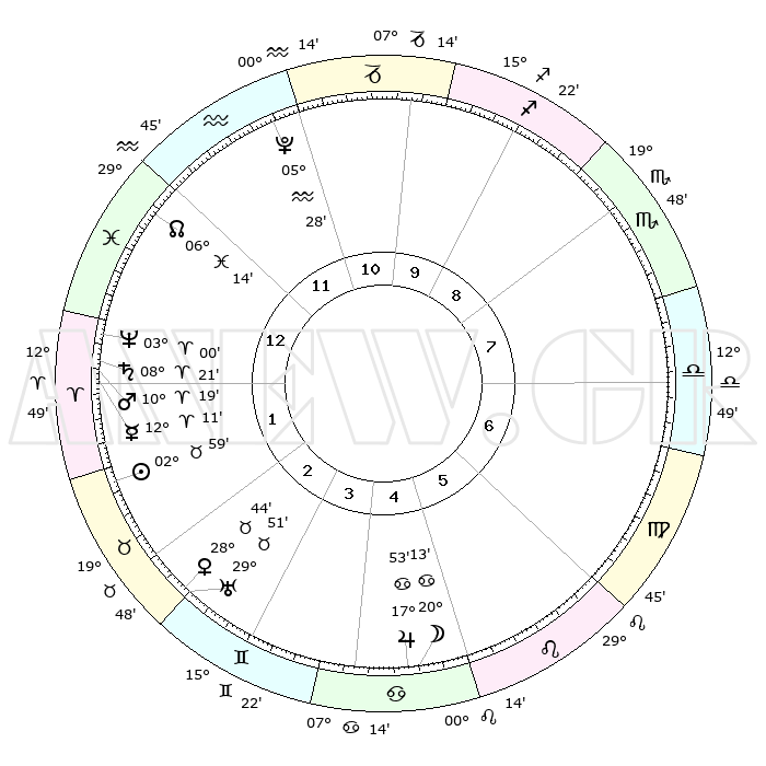 | | ΘΕΣΕΙΣ ΠΛΑΝΗΤΩΝ ΑΣΤΡΟΛΟΓΙΚΟΥ ΧΑΡΤΗ ΤΗΣ ΣΤΙΓΜΗΣ ΑΥΤΗΣ | | | | Πλανήτης | Ζώδιο | Μοίρες | Δεκαήμ. | Σε οίκο | Απόκλιση | | Ακμές των οίκων | | Ηλιος | Ταύρος | 02°55' | Πρώτο | 2 | 12 N 29 | | 1ος | 04°09' | Ιχθείς | | Σελήνη | Καρκίνος | 19°16' | Δεύτερο | 5 | 25 N 49 | | 2ος | 19°11' | Κριός | | Ερμής | Κριός | 12°04' | Δεύτερο | 1 | 02 N 26 | | 3ος | 21°05' | Ταύρος | | Αφροδίτη | Ταύρος | 28°39' | Τρίτο | 3 | 20 N 23 | | 4ος | 15°05' | Δίδυμοι | | Αρης | Κριός | 10°16' | Δεύτερο | 1 | 03 N 12 | | 5ος | 06°46' | Καρκίνος | | Δίας | Καρκίνος | 17°53' | Δεύτερο | 5 | 22 N 37 | | 6ος | 00°46' | Λέων | | Κρόνος | Κριός | 08°21' | Πρώτο | 1 | 01 N 20 | | 7ος | 04°09' | Παρθένος | | Ουρανός | Ταύρος | 29°51' | Τρίτο | 3 | 19 N 57 | | 8ος | 19°11' | Ζυγός | | Ποσειδώνας | Κριός | 03°00' | Πρώτο | 1 | 00 S 01 | | 9ος | 21°05' | Σκορπιός | | Πλούτωνας | Υδροχόος | 05°28' | Πρώτο | 12 | 22 S 48 | | 10ος | 15°05' | Τοξότης | | Β. Δεσμός | Ιχθείς | 06°14' | Πρώτο | 1 | 09 S 13 | | 11ος | 06°46' | Αιγόκερως | | Ωροσκόπος | Ιχθείς | 04°09' | Πρώτο | | | 12ος | 00°46' | Υδροχόος | | Μεσουράνημα | Τοξότης | 15°05' | Δεύτερο | | | |