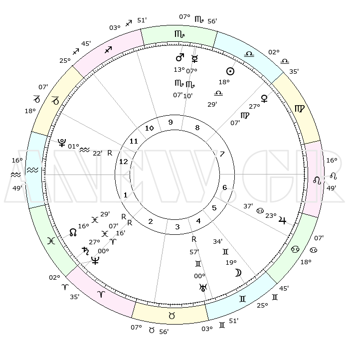 | ΘΕΣΕΙΣ ΠΛΑΝΗΤΩΝ ΑΣΤΡΟΛΟΓΙΚΟΥ ΧΑΡΤΗ ΤΗΣ ΣΤΙΓΜΗΣ ΑΥΤΗΣ | | Πλανήτης | Ζώδιο | Μοίρες | Δεκαήμ. | Σε οίκο | Απόκλιση | | Ακμές των οίκων | Ηλιος | Ζυγός | 18°17' | Δεύτερο | 10 | 07 S 10 | | 1ος | 04°13' | Τοξότης | Σελήνη | Δίδυμοι | 16°39' | Δεύτερο | 7 | 27 N 57 | | 2ος | 05°57' | Αιγόκερως | Ερμής | Σκορπιός | 06°53' | Πρώτο | 11 | 15 S 04 | | 3ος | 12°22' | Υδροχόος | Αφροδίτη | Παρθένος | 26°52' | Τρίτο | 10 | 02 N 36 | | 4ος | 18°28' | Ιχθείς | Αρης | Σκορπιός | 12°58' | Δεύτερο | 11 | 15 S 54 | | 5ος | 18°56' | Κριός | Δίας | Καρκίνος | 23°36' | Τρίτο | 8 | 21 N 25 | | 6ος | 13°25' | Ταύρος | Κρόνος | Ιχθείς | 27°08'R | Τρίτο | 4 | 03 S 26 | | 7ος | 04°13' | Δίδυμοι | Ουρανός | Δίδυμοι | 00°58'R | Πρώτο | 6 | 20 N 08 | | 8ος | 05°57' | Καρκίνος | Ποσειδώνας | Κριός | 00°16'R | Πρώτο | 4 | 01 S 09 | | 9ος | 12°22' | Λέων | Πλούτωνας | Υδροχόος | 01°22'R | Πρώτο | 2 | 23 S 32 | | 10ος | 18°28' | Παρθένος | Β. Δεσμός | Ιχθείς | 16°30' | Δεύτερο | 3 | 05 S 20 | | 11ος | 18°56' | Ζυγός | Ωροσκόπος | Τοξότης | 04°13' | Πρώτο | | | 12ος | 13°25' | Σκορπιός | Μεσουράνημα | Παρθένος | 18°28' | Δεύτερο | | | |