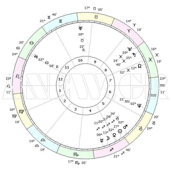 | | ΘΕΣΕΙΣ ΠΛΑΝΗΤΩΝ ΑΣΤΡΟΛΟΓΙΚΟΥ ΧΑΡΤΗ ΤΗΣ ΣΤΙΓΜΗΣ ΑΥΤΗΣ | | | | Πλανήτης | Ζώδιο | Μοίρες | Δεκαήμ. | Σε οίκο | Απόκλιση | | Ακμές των οίκων | | Ηλιος | Τοξότης | 27°04' | Τρίτο | 5 | 23 S 24 | | 1ος | 02°51' | Λέων | | Σελήνη | Τοξότης | 12°30' | Δεύτερο | 5 | 27 S 15 | | 2ος | 24°05' | Λέων | | Ερμής | Τοξότης | 09°05' | Πρώτο | 5 | 20 S 46 | | 3ος | 19°32' | Παρθένος | | Αφροδίτη | Τοξότης | 22°32' | Τρίτο | 5 | 23 S 13 | | 4ος | 20°54' | Ζυγός | | Αρης | Αιγόκερως | 02°36' | Πρώτο | 6 | 24 S 13 | | 5ος | 26°52' | Σκορπιός | | Δίας | Καρκίνος | 22°58'R | Τρίτο | 12 | 21 N 41 | | 6ος | 02°06' | Αιγόκερως | | Κρόνος | Ιχθείς | 25°39' | Τρίτο | 9 | 03 S 51 | | 7ος | 02°51' | Υδροχόος | | Ουρανός | Ταύρος | 28°22'R | Τρίτο | 11 | 19 N 36 | | 8ος | 24°05' | Υδροχόος | | Ποσειδώνας | Ιχθείς | 29°24' | Τρίτο | 9 | 01 S 28 | | 9ος | 19°31' | Ιχθείς | | Πλούτωνας | Υδροχόος | 02°20' | Πρώτο | 6 | 23 S 18 | | 10ος | 20°54' | Κριός | | Β. Δεσμός | Ιχθείς | 12°52' | Δεύτερο | 8 | 06 S 44 | | 11ος | 26°52' | Ταύρος | | Ωροσκόπος | Λέων | 02°51' | Πρώτο | | | 12ος | 02°06' | Καρκίνος | | Μεσουράνημα | Κριός | 20°54' | Τρίτο | | | |
