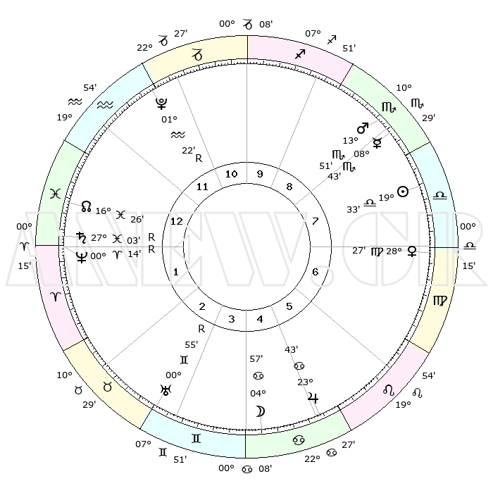 | ΘΕΣΕΙΣ ΠΛΑΝΗΤΩΝ ΑΣΤΡΟΛΟΓΙΚΟΥ ΧΑΡΤΗ ΤΗΣ ΣΤΙΓΜΗΣ ΑΥΤΗΣ | | Πλανήτης | Ζώδιο | Μοίρες | Δεκαήμ. | Σε οίκο | Απόκλιση | | Ακμές των οίκων | Ηλιος | Ζυγός | 19°26' | Δεύτερο | 8 | 07 S 36 | | 1ος | 06°01' | Υδροχόος | Σελήνη | Καρκίνος | 03°31' | Πρώτο | 5 | 28 N 24 | | 2ος | 20°59' | Ιχθείς | Ερμής | Σκορπιός | 08°34' | Πρώτο | 9 | 15 S 44 | | 3ος | 28°24' | Κριός | Αφροδίτη | Παρθένος | 28°19' | Τρίτο | 8 | 02 N 02 | | 4ος | 25°53' | Ταύρος | Αρης | Σκορπιός | 13°47' | Δεύτερο | 9 | 16 S 10 | | 5ος | 18°15' | Δίδυμοι | Δίας | Καρκίνος | 23°42' | Τρίτο | 6 | 21 N 24 | | 6ος | 09°56' | Καρκίνος | Κρόνος | Ιχθείς | 27°03'R | Τρίτο | 2 | 03 S 28 | | 7ος | 06°01' | Λέων | Ουρανός | Δίδυμοι | 00°56'R | Πρώτο | 4 | 20 N 08 | | 8ος | 20°59' | Παρθένος | Ποσειδώνας | Κριός | 00°14'R | Πρώτο | 2 | 01 S 10 | | 9ος | 28°24' | Ζυγός | Πλούτωνας | Υδροχόος | 01°22'R | Πρώτο | 12 | 23 S 32 | | 10ος | 25°53' | Σκορπιός | Β. Δεσμός | Ιχθείς | 16°26' | Δεύτερο | 1 | 05 S 21 | | 11ος | 18°15' | Τοξότης | Ωροσκόπος | Υδροχόος | 06°01' | Πρώτο | | | 12ος | 09°56' | Αιγόκερως | Μεσουράνημα | Σκορπιός | 25°53' | Τρίτο | | | |