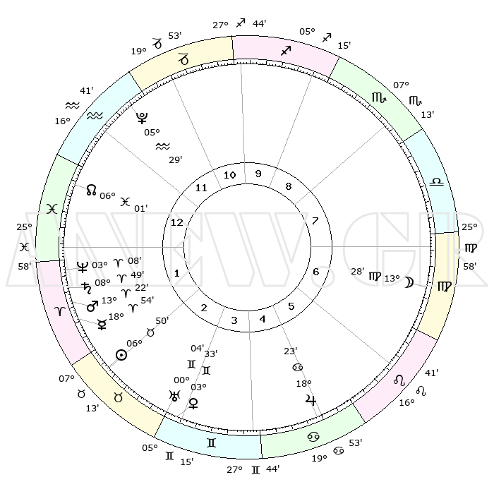 | | ΘΕΣΕΙΣ ΠΛΑΝΗΤΩΝ ΑΣΤΡΟΛΟΓΙΚΟΥ ΧΑΡΤΗ ΤΗΣ ΣΤΙΓΜΗΣ ΑΥΤΗΣ | | | | Πλανήτης | Ζώδιο | Μοίρες | Δεκαήμ. | Σε οίκο | Απόκλιση | | Ακμές των οίκων | | Ηλιος | Ταύρος | 06°47' | Πρώτο | 2 | 13 N 46 | | 1ος | 19°03' | Υδροχόος | | Σελήνη | Παρθένος | 12°36' | Δεύτερο | 7 | 06 N 24 | | 2ος | 04°52' | Κριός | | Ερμής | Κριός | 18°47' | Δεύτερο | 2 | 05 N 14 | | 3ος | 09°46' | Ταύρος | | Αφροδίτη | Δίδυμοι | 03°28' | Πρώτο | 3 | 21 N 33 | | 4ος | 05°23' | Δίδυμοι | | Αρης | Κριός | 13°19' | Δεύτερο | 2 | 04 N 25 | | 5ος | 27°14' | Δίδυμοι | | Δίας | Καρκίνος | 18°23' | Δεύτερο | 5 | 22 N 33 | | 6ος | 19°47' | Καρκίνος | | Κρόνος | Κριός | 08°48' | Πρώτο | 2 | 01 N 30 | | 7ος | 19°03' | Λέων | | Ουρανός | Δίδυμοι | 00°03' | Πρώτο | 3 | 20 N 00 | | 8ος | 04°52' | Ζυγός | | Ποσειδώνας | Κριός | 03°08' | Πρώτο | 1 | 00 N 02 | | 9ος | 09°46' | Σκορπιός | | Πλούτωνας | Υδροχόος | 05°29' | Πρώτο | 12 | 22 S 48 | | 10ος | 05°23' | Τοξότης | | Β. Δεσμός | Ιχθείς | 06°02' | Πρώτο | 1 | 09 S 18 | | 11ος | 27°14' | Τοξότης | | Ωροσκόπος | Υδροχόος | 19°03' | Δεύτερο | | | 12ος | 19°47' | Αιγόκερως | | Μεσουράνημα | Τοξότης | 05°23' | Πρώτο | | | |