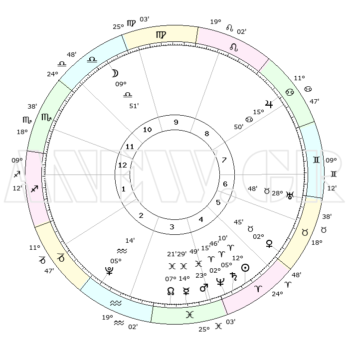 | | ΘΕΣΕΙΣ ΠΛΑΝΗΤΩΝ ΑΣΤΡΟΛΟΓΙΚΟΥ ΧΑΡΤΗ ΤΗΣ ΣΤΙΓΜΗΣ ΑΥΤΗΣ | | | | Πλανήτης | Ζώδιο | Μοίρες | Δεκαήμ. | Σε οίκο | Απόκλιση | | Ακμές των οίκων | | Ηλιος | Κριός | 12°06' | Δεύτερο | 5 | 04 N 47 | | 1ος | 19°40' | Σκορπιός | | Σελήνη | Ζυγός | 09°00' | Πρώτο | 11 | 05 S 59 | | 2ος | 19°35' | Τοξότης | | Ερμής | Ιχθείς | 14°25' | Δεύτερο | 4 | 07 S 27 | | 3ος | 23°41' | Αιγόκερως | | Αφροδίτη | Ταύρος | 02°40' | Πρώτο | 6 | 12 N 01 | | 4ος | 29°16' | Υδροχόος | | Αρης | Ιχθείς | 23°46' | Τρίτο | 4 | 03 S 26 | | 5ος | 01°22' | Κριός | | Δίας | Καρκίνος | 15°50' | Δεύτερο | 8 | 22 N 52 | | 6ος | 27°49' | Κριός | | Κρόνος | Κριός | 05°46' | Πρώτο | 5 | 00 N 20 | | 7ος | 19°40' | Ταύρος | | Ουρανός | Ταύρος | 28°48' | Τρίτο | 7 | 19 N 43 | | 8ος | 19°35' | Δίδυμοι | | Ποσειδώνας | Κριός | 02°14' | Πρώτο | 5 | 00 S 19 | | 9ος | 23°41' | Καρκίνος | | Πλούτωνας | Υδροχόος | 05°14' | Πρώτο | 3 | 22 S 47 | | 10ος | 29°16' | Λέων | | Β. Δεσμός | Ιχθείς | 07°22' | Πρώτο | 4 | 08 S 48 | | 11ος | 01°22' | Ζυγός | | Ωροσκόπος | Σκορπιός | 19°40' | Δεύτερο | | | 12ος | 27°49' | Ζυγός | | Μεσουράνημα | Λέων | 29°16' | Τρίτο | | | |