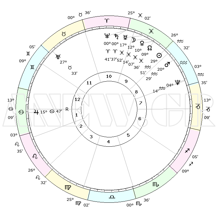 | | ΘΕΣΕΙΣ ΠΛΑΝΗΤΩΝ ΑΣΤΡΟΛΟΓΙΚΟΥ ΧΑΡΤΗ ΤΗΣ ΣΤΙΓΜΗΣ ΑΥΤΗΣ | | | | Πλανήτης | Ζώδιο | Μοίρες | Δεκαήμ. | Σε οίκο | Απόκλιση | | Ακμές των οίκων | | Ηλιος | Υδροχόος | 29°46' | Τρίτο | 10 | 11 S 33 | | 1ος | 18°07' | Δίδυμοι | | Σελήνη | Ιχθείς | 11°14' | Δεύτερο | 10 | 07 S 10 | | 2ος | 09°59' | Καρκίνος | | Ερμής | Ιχθείς | 17°47' | Δεύτερο | 10 | 04 S 02 | | 3ος | 01°16' | Λέων | | Αφροδίτη | Ιχθείς | 10°02' | Δεύτερο | 10 | 09 S 09 | | 4ος | 25°51' | Λέων | | Αρης | Υδροχόος | 20°26' | Τρίτο | 9 | 15 S 42 | | 5ος | 27°41' | Παρθένος | | Δίας | Καρκίνος | 15°47'R | Δεύτερο | 2 | 22 N 50 | | 6ος | 07°56' | Σκορπιός | | Κρόνος | Κριός | 00°37' | Πρώτο | 11 | 01 S 44 | | 7ος | 18°07' | Τοξότης | | Ουρανός | Ταύρος | 27°33' | Τρίτο | 12 | 19 N 26 | | 8ος | 09°59' | Αιγόκερως | | Ποσειδώνας | Κριός | 00°41' | Πρώτο | 11 | 00 S 56 | | 9ος | 01°16' | Υδροχόος | | Πλούτωνας | Υδροχόος | 04°14' | Πρώτο | 9 | 22 S 55 | | 10ος | 25°51' | Υδροχόος | | Β. Δεσμός | Ιχθείς | 09°36' | Πρώτο | 10 | 07 S 58 | | 11ος | 27°41' | Ιχθείς | | Ωροσκόπος | Δίδυμοι | 18°07' | Δεύτερο | | | 12ος | 07°56' | Ταύρος | | Μεσουράνημα | Υδροχόος | 25°51' | Τρίτο | | | |
