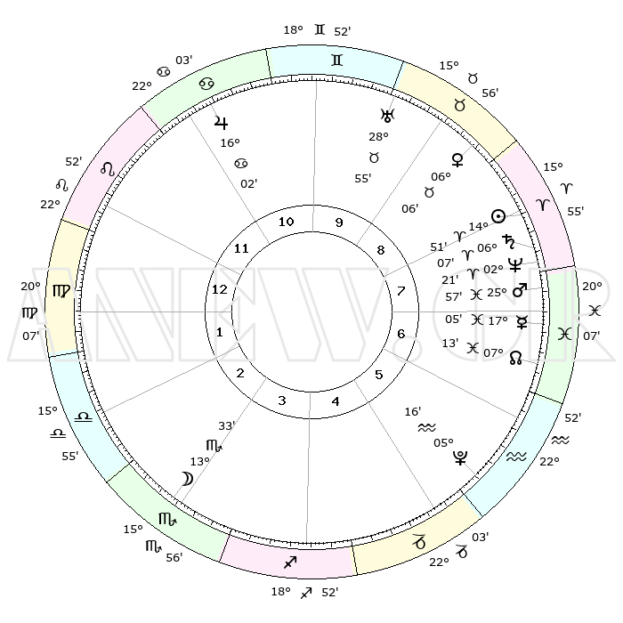 | | ΘΕΣΕΙΣ ΠΛΑΝΗΤΩΝ ΑΣΤΡΟΛΟΓΙΚΟΥ ΧΑΡΤΗ ΤΗΣ ΣΤΙΓΜΗΣ ΑΥΤΗΣ | | | | Πλανήτης | Ζώδιο | Μοίρες | Δεκαήμ. | Σε οίκο | Απόκλιση | | Ακμές των οίκων | | Ηλιος | Κριός | 14°47' | Δεύτερο | 8 | 05 N 49 | | 1ος | 01°23' | Παρθένος | | Σελήνη | Σκορπιός | 12°47' | Δεύτερο | 3 | 20 S 06 | | 2ος | 25°23' | Παρθένος | | Ερμής | Ιχθείς | 17°01' | Δεύτερο | 7 | 06 S 47 | | 3ος | 24°11' | Ζυγός | | Αφροδίτη | Ταύρος | 06°01' | Πρώτο | 9 | 13 N 15 | | 4ος | 27°07' | Σκορπιός | | Αρης | Ιχθείς | 25°54' | Τρίτο | 8 | 02 S 34 | | 5ος | 01°13' | Αιγόκερως | | Δίας | Καρκίνος | 16°02' | Δεύτερο | 11 | 22 N 50 | | 6ος | 03°04' | Υδροχόος | | Κρόνος | Κριός | 06°06' | Πρώτο | 8 | 00 N 28 | | 7ος | 01°23' | Ιχθείς | | Ουρανός | Ταύρος | 28°55' | Τρίτο | 10 | 19 N 45 | | 8ος | 25°23' | Ιχθείς | | Ποσειδώνας | Κριός | 02°21' | Πρώτο | 8 | 00 S 16 | | 9ος | 24°11' | Κριός | | Πλούτωνας | Υδροχόος | 05°16' | Πρώτο | 6 | 22 S 47 | | 10ος | 27°07' | Ταύρος | | Β. Δεσμός | Ιχθείς | 07°13' | Πρώτο | 7 | 08 S 52 | | 11ος | 01°13' | Καρκίνος | | Ωροσκόπος | Παρθένος | 01°23' | Πρώτο | | | 12ος | 03°04' | Λέων | | Μεσουράνημα | Ταύρος | 27°07' | Τρίτο | | | |