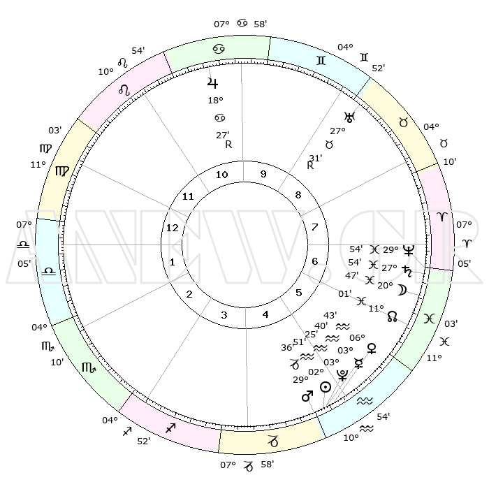 | | ΘΕΣΕΙΣ ΠΛΑΝΗΤΩΝ ΑΣΤΡΟΛΟΓΙΚΟΥ ΧΑΡΤΗ ΤΗΣ ΣΤΙΓΜΗΣ ΑΥΤΗΣ | | | | Πλανήτης | Ζώδιο | Μοίρες | Δεκαήμ. | Σε οίκο | Απόκλιση | | Ακμές των οίκων | | Ηλιος | Υδροχόος | 02°46' | Πρώτο | 5 | 19 S 32 | | 1ος | 13°33' | Παρθένος | | Σελήνη | Ιχθείς | 19°43' | Δεύτερο | 7 | 03 S 12 | | 2ος | 08°47' | Ζυγός | | Ερμής | Υδροχόος | 03°32' | Πρώτο | 5 | 21 S 23 | | 3ος | 08°27' | Σκορπιός | | Αφροδίτη | Υδροχόος | 06°37' | Πρώτο | 5 | 19 S 46 | | 4ος | 11°23' | Τοξότης | | Αρης | Αιγόκερως | 29°33' | Τρίτο | 5 | 21 S 14 | | 5ος | 14°49' | Αιγόκερως | | Δίας | Καρκίνος | 18°27'R | Δεύτερο | 11 | 22 N 27 | | 6ος | 15°55' | Υδροχόος | | Κρόνος | Ιχθείς | 27°54' | Τρίτο | 7 | 02 S 51 | | 7ος | 13°33' | Ιχθείς | | Ουρανός | Ταύρος | 27°31'R | Τρίτο | 9 | 19 N 25 | | 8ος | 08°47' | Κριός | | Ποσειδώνας | Ιχθείς | 29°54' | Τρίτο | 7 | 01 S 15 | | 9ος | 08°27' | Ταύρος | | Πλούτωνας | Υδροχόος | 03°24' | Πρώτο | 5 | 23 S 05 | | 10ος | 11°23' | Δίδυμοι | | Β. Δεσμός | Ιχθείς | 11°01' | Δεύτερο | 6 | 07 S 26 | | 11ος | 14°49' | Καρκίνος | | Ωροσκόπος | Παρθένος | 13°33' | Δεύτερο | | | 12ος | 15°55' | Λέων | | Μεσουράνημα | Δίδυμοι | 11°23' | Δεύτερο | | | |