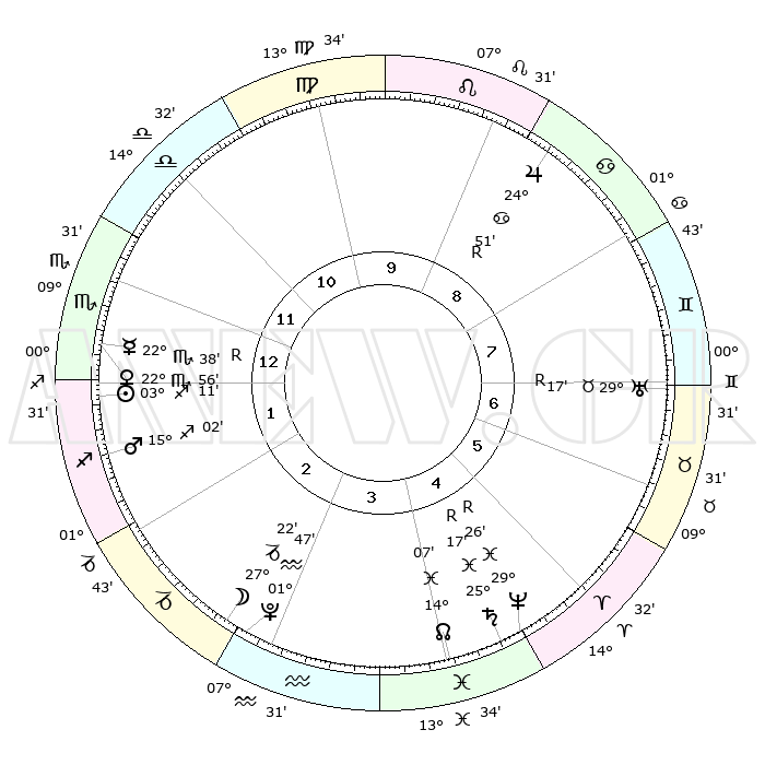 | | ΘΕΣΕΙΣ ΠΛΑΝΗΤΩΝ ΑΣΤΡΟΛΟΓΙΚΟΥ ΧΑΡΤΗ ΤΗΣ ΣΤΙΓΜΗΣ ΑΥΤΗΣ | | | | Πλανήτης | Ζώδιο | Μοίρες | Δεκαήμ. | Σε οίκο | Απόκλιση | | Ακμές των οίκων | | Ηλιος | Τοξότης | 03°06' | Πρώτο | 1 | 20 S 46 | | 1ος | 06°21' | Σκορπιός | | Σελήνη | Αιγόκερως | 26°21' | Τρίτο | 3 | 24 S 33 | | 2ος | 05°10' | Τοξότης | | Ερμής | Σκορπιός | 22°42'R | Τρίτο | 1 | 16 S 36 | | 3ος | 07°41' | Αιγόκερως | | Αφροδίτη | Σκορπιός | 22°50' | Τρίτο | 1 | 17 S 36 | | 4ος | 12°19' | Υδροχόος | | Αρης | Τοξότης | 14°58' | Δεύτερο | 2 | 23 S 12 | | 5ος | 15°07' | Ιχθείς | | Δίας | Καρκίνος | 24°51'R | Τρίτο | 9 | 21 N 18 | | 6ος | 13°09' | Κριός | | Κρόνος | Ιχθείς | 25°17'R | Τρίτο | 5 | 04 S 04 | | 7ος | 06°21' | Ταύρος | | Ουρανός | Ταύρος | 29°17'R | Τρίτο | 7 | 19 N 47 | | 8ος | 05°10' | Δίδυμοι | | Ποσειδώνας | Ιχθείς | 29°26'R | Τρίτο | 5 | 01 S 28 | | 9ος | 07°41' | Καρκίνος | | Πλούτωνας | Υδροχόος | 01°47' | Πρώτο | 3 | 23 S 26 | | 10ος | 12°19' | Λέων | | Β. Δεσμός | Ιχθείς | 14°07' | Δεύτερο | 4 | 06 S 15 | | 11ος | 15°07' | Παρθένος | | Ωροσκόπος | Σκορπιός | 06°21' | Πρώτο | | | 12ος | 13°09' | Ζυγός | | Μεσουράνημα | Λέων | 12°19' | Δεύτερο | | | |