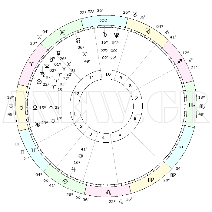 | | ΘΕΣΕΙΣ ΠΛΑΝΗΤΩΝ ΑΣΤΡΟΛΟΓΙΚΟΥ ΧΑΡΤΗ ΤΗΣ ΣΤΙΓΜΗΣ ΑΥΤΗΣ | | | | Πλανήτης | Ζώδιο | Μοίρες | Δεκαήμ. | Σε οίκο | Απόκλιση | | Ακμές των οίκων | | Ηλιος | Κριός | 22°14' | Τρίτο | 1 | 08 N 39 | | 1ος | 03°21' | Κριός | | Σελήνη | Υδροχόος | 14°06' | Δεύτερο | 11 | 18 S 37 | | 2ος | 12°49' | Ταύρος | | Ερμής | Ιχθείς | 25°55' | Τρίτο | 12 | 03 S 53 | | 3ος | 09°43' | Δίδυμοι | | Αφροδίτη | Ταύρος | 15°19' | Δεύτερο | 2 | 16 N 28 | | 4ος | 01°53' | Καρκίνος | | Αρης | Κριός | 01°49' | Πρώτο | 12 | 00 S 12 | | 5ος | 24°21' | Καρκίνος | | Δίας | Καρκίνος | 16°41' | Δεύτερο | 4 | 22 N 46 | | 6ος | 22°16' | Λέων | | Κρόνος | Κριός | 07°02' | Πρώτο | 1 | 00 N 50 | | 7ος | 03°21' | Ζυγός | | Ουρανός | Ταύρος | 29°17' | Τρίτο | 2 | 19 N 50 | | 8ος | 12°49' | Σκορπιός | | Ποσειδώνας | Κριός | 02°37' | Πρώτο | 12 | 00 S 10 | | 9ος | 09°43' | Τοξότης | | Πλούτωνας | Υδροχόος | 05°22' | Πρώτο | 11 | 22 S 47 | | 10ος | 01°53' | Αιγόκερως | | Β. Δεσμός | Ιχθείς | 06°49' | Πρώτο | 12 | 09 S 00 | | 11ος | 24°21' | Αιγόκερως | | Ωροσκόπος | Κριός | 03°21' | Πρώτο | | | 12ος | 22°16' | Υδροχόος | | Μεσουράνημα | Αιγόκερως | 01°53' | Πρώτο | | | |