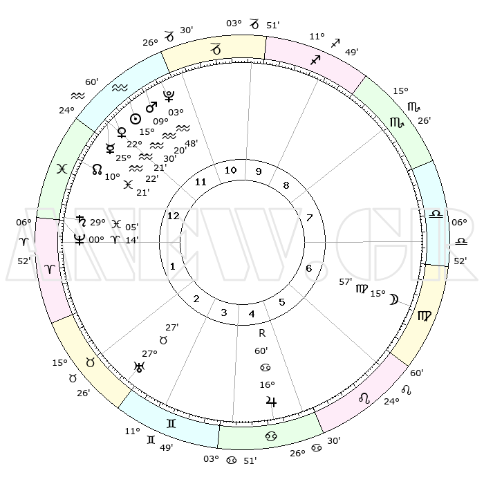 | | ΘΕΣΕΙΣ ΠΛΑΝΗΤΩΝ ΑΣΤΡΟΛΟΓΙΚΟΥ ΧΑΡΤΗ ΤΗΣ ΣΤΙΓΜΗΣ ΑΥΤΗΣ | | | | Πλανήτης | Ζώδιο | Μοίρες | Δεκαήμ. | Σε οίκο | Απόκλιση | | Ακμές των οίκων | | Ηλιος | Υδροχόος | 15°27' | Δεύτερο | 12 | 16 S 12 | | 1ος | 08°08' | Ιχθείς | | Σελήνη | Παρθένος | 15°18' | Δεύτερο | 7 | 05 N 16 | | 2ος | 22°41' | Κριός | | Ερμής | Υδροχόος | 25°17' | Τρίτο | 12 | 14 S 38 | | 3ος | 23°49' | Ταύρος | | Αφροδίτη | Υδροχόος | 22°18' | Τρίτο | 12 | 15 S 24 | | 4ος | 17°29' | Δίδυμοι | | Αρης | Υδροχόος | 09°18' | Πρώτο | 12 | 18 S 56 | | 5ος | 09°12' | Καρκίνος | | Δίας | Καρκίνος | 17°00'R | Δεύτερο | 5 | 22 N 40 | | 6ος | 03°39' | Λέων | | Κρόνος | Ιχθείς | 29°05' | Τρίτο | 1 | 02 S 21 | | 7ος | 08°08' | Παρθένος | | Ουρανός | Ταύρος | 27°27' | Τρίτο | 3 | 19 N 24 | | 8ος | 22°41' | Ζυγός | | Ποσειδώνας | Κριός | 00°14' | Πρώτο | 1 | 01 S 07 | | 9ος | 23°49' | Σκορπιός | | Πλούτωνας | Υδροχόος | 03°48' | Πρώτο | 12 | 23 S 00 | | 10ος | 17°29' | Τοξότης | | Β. Δεσμός | Ιχθείς | 10°21' | Δεύτερο | 1 | 07 S 41 | | 11ος | 09°12' | Αιγόκερως | | Ωροσκόπος | Ιχθείς | 08°08' | Πρώτο | | | 12ος | 03°39' | Υδροχόος | | Μεσουράνημα | Τοξότης | 17°29' | Δεύτερο | | | |