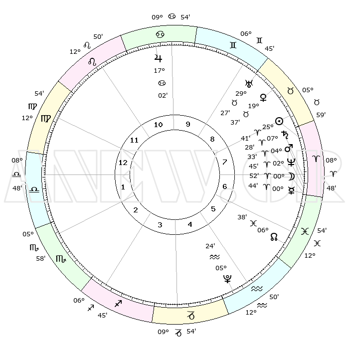 | | ΘΕΣΕΙΣ ΠΛΑΝΗΤΩΝ ΑΣΤΡΟΛΟΓΙΚΟΥ ΧΑΡΤΗ ΤΗΣ ΣΤΙΓΜΗΣ ΑΥΤΗΣ | | | | Πλανήτης | Ζώδιο | Μοίρες | Δεκαήμ. | Σε οίκο | Απόκλιση | | Ακμές των οίκων | | Ηλιος | Κριός | 25°37' | Τρίτο | 8 | 09 N 54 | | 1ος | 17°06' | Παρθένος | | Σελήνη | Ιχθείς | 29°50' | Τρίτο | 7 | 01 N 41 | | 2ος | 12°38' | Ζυγός | | Ερμής | Κριός | 00°37' | Πρώτο | 7 | 02 S 09 | | 3ος | 12°30' | Σκορπιός | | Αφροδίτη | Ταύρος | 19°32' | Δεύτερο | 9 | 17 N 48 | | 4ος | 15°26' | Τοξότης | | Αρης | Κριός | 04°29' | Πρώτο | 7 | 00 N 53 | | 5ος | 18°43' | Αιγόκερως | | Δίας | Καρκίνος | 17°02' | Δεύτερο | 10 | 22 N 44 | | 6ος | 19°40' | Υδροχόος | | Κρόνος | Κριός | 07°27' | Πρώτο | 7 | 00 N 59 | | 7ος | 17°06' | Ιχθείς | | Ουρανός | Ταύρος | 29°27' | Τρίτο | 9 | 19 N 52 | | 8ος | 12°38' | Κριός | | Ποσειδώνας | Κριός | 02°45' | Πρώτο | 7 | 00 S 07 | | 9ος | 12°30' | Ταύρος | | Πλούτωνας | Υδροχόος | 05°24' | Πρώτο | 5 | 22 S 47 | | 10ος | 15°26' | Δίδυμοι | | Β. Δεσμός | Ιχθείς | 06°38' | Πρώτο | 6 | 09 S 04 | | 11ος | 18°43' | Καρκίνος | | Ωροσκόπος | Παρθένος | 17°06' | Δεύτερο | | | 12ος | 19°40' | Λέων | | Μεσουράνημα | Δίδυμοι | 15°26' | Δεύτερο | | | |