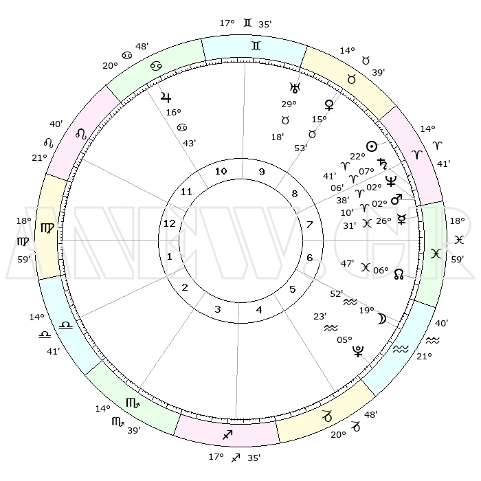 | | ΘΕΣΕΙΣ ΠΛΑΝΗΤΩΝ ΑΣΤΡΟΛΟΓΙΚΟΥ ΧΑΡΤΗ ΤΗΣ ΣΤΙΓΜΗΣ ΑΥΤΗΣ | | | | Πλανήτης | Ζώδιο | Μοίρες | Δεκαήμ. | Σε οίκο | Απόκλιση | | Ακμές των οίκων | | Ηλιος | Κριός | 22°38' | Τρίτο | 8 | 08 N 48 | | 1ος | 01°29' | Παρθένος | | Σελήνη | Υδροχόος | 19°07' | Δεύτερο | 6 | 16 S 42 | | 2ος | 25°30' | Παρθένος | | Ερμής | Ιχθείς | 26°27' | Τρίτο | 8 | 03 S 42 | | 3ος | 24°18' | Ζυγός | | Αφροδίτη | Ταύρος | 15°48' | Δεύτερο | 9 | 16 N 37 | | 4ος | 27°14' | Σκορπιός | | Αρης | Κριός | 02°07' | Πρώτο | 8 | 00 S 04 | | 5ος | 01°19' | Αιγόκερως | | Δίας | Καρκίνος | 16°43' | Δεύτερο | 11 | 22 N 46 | | 6ος | 03°10' | Υδροχόος | | Κρόνος | Κριός | 07°05' | Πρώτο | 8 | 00 N 51 | | 7ος | 01°29' | Ιχθείς | | Ουρανός | Ταύρος | 29°18' | Τρίτο | 10 | 19 N 50 | | 8ος | 25°30' | Ιχθείς | | Ποσειδώνας | Κριός | 02°38' | Πρώτο | 8 | 00 S 09 | | 9ος | 24°18' | Κριός | | Πλούτωνας | Υδροχόος | 05°23' | Πρώτο | 6 | 22 S 47 | | 10ος | 27°14' | Ταύρος | | Β. Δεσμός | Ιχθείς | 06°48' | Πρώτο | 7 | 09 S 01 | | 11ος | 01°19' | Καρκίνος | | Ωροσκόπος | Παρθένος | 01°29' | Πρώτο | | | 12ος | 03°10' | Λέων | | Μεσουράνημα | Ταύρος | 27°14' | Τρίτο | | | |