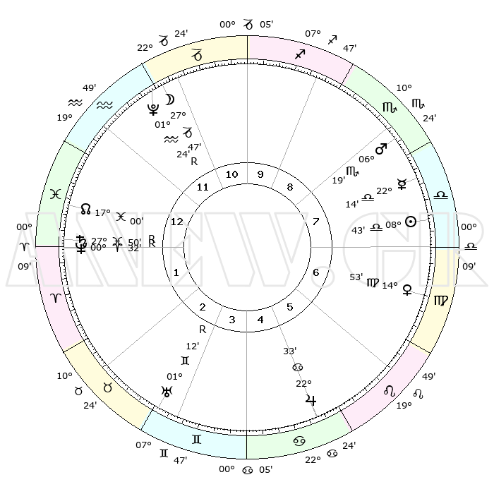 | ΘΕΣΕΙΣ ΠΛΑΝΗΤΩΝ ΑΣΤΡΟΛΟΓΙΚΟΥ ΧΑΡΤΗ ΤΗΣ ΣΤΙΓΜΗΣ ΑΥΤΗΣ | | Πλανήτης | Ζώδιο | Μοίρες | Δεκαήμ. | Σε οίκο | Απόκλιση | | Ακμές των οίκων | Ηλιος | Ζυγός | 08°38' | Πρώτο | 8 | 03 S 25 | | 1ος | 13°01' | Υδροχόος | Σελήνη | Αιγόκερως | 26°42' | Τρίτο | 12 | 24 S 51 | | 2ος | 28°36' | Ιχθείς | Ερμής | Ζυγός | 22°06' | Τρίτο | 8 | 08 S 46 | | 3ος | 04°43' | Ταύρος | Αφροδίτη | Παρθένος | 14°47' | Δεύτερο | 7 | 07 N 12 | | 4ος | 01°08' | Δίδυμοι | Αρης | Σκορπιός | 06°16' | Πρώτο | 9 | 13 S 41 | | 5ος | 23°10' | Δίδυμοι | Δίας | Καρκίνος | 22°32' | Τρίτο | 6 | 21 N 34 | | 6ος | 15°16' | Καρκίνος | Κρόνος | Ιχθείς | 27°51'R | Τρίτο | 1 | 03 S 10 | | 7ος | 13°01' | Λέων | Ουρανός | Δίδυμοι | 01°12'R | Πρώτο | 4 | 20 N 11 | | 8ος | 28°36' | Παρθένος | Ποσειδώνας | Κριός | 00°32'R | Πρώτο | 2 | 01 S 03 | | 9ος | 04°43' | Σκορπιός | Πλούτωνας | Υδροχόος | 01°24'R | Πρώτο | 12 | 23 S 32 | | 10ος | 01°08' | Τοξότης | Β. Δεσμός | Ιχθείς | 17°01' | Δεύτερο | 1 | 05 S 08 | | 11ος | 23°10' | Τοξότης | Ωροσκόπος | Υδροχόος | 13°01' | Δεύτερο | | | 12ος | 15°16' | Αιγόκερως | Μεσουράνημα | Τοξότης | 01°08' | Πρώτο | | | |