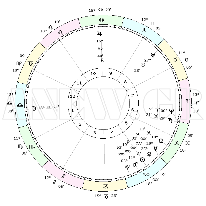 | | ΘΕΣΕΙΣ ΠΛΑΝΗΤΩΝ ΑΣΤΡΟΛΟΓΙΚΟΥ ΧΑΡΤΗ ΤΗΣ ΣΤΙΓΜΗΣ ΑΥΤΗΣ | | | | Πλανήτης | Ζώδιο | Μοίρες | Δεκαήμ. | Σε οίκο | Απόκλιση | | Ακμές των οίκων | | Ηλιος | Υδροχόος | 17°60' | Δεύτερο | 5 | 15 S 26 | | 1ος | 24°11' | Παρθένος | | Σελήνη | Ζυγός | 17°32' | Δεύτερο | 1 | 09 S 54 | | 2ος | 20°19' | Ζυγός | | Ερμής | Υδροχόος | 29°43' | Τρίτο | 6 | 12 S 50 | | 3ος | 20°32' | Σκορπιός | | Αφροδίτη | Υδροχόος | 25°27' | Τρίτο | 5 | 14 S 23 | | 4ος | 23°28' | Τοξότης | | Αρης | Υδροχόος | 11°16' | Δεύτερο | 5 | 18 S 25 | | 5ος | 26°32' | Αιγόκερως | | Δίας | Καρκίνος | 16°45'R | Δεύτερο | 10 | 22 N 42 | | 6ος | 27°12' | Υδροχόος | | Κρόνος | Ιχθείς | 29°21' | Τρίτο | 7 | 02 S 15 | | 7ος | 24°11' | Ιχθείς | | Ουρανός | Ταύρος | 27°28' | Τρίτο | 9 | 19 N 24 | | 8ος | 20°20' | Κριός | | Ποσειδώνας | Κριός | 00°19' | Πρώτο | 7 | 01 S 05 | | 9ος | 20°31' | Ταύρος | | Πλούτωνας | Υδροχόος | 03°53' | Πρώτο | 5 | 22 S 59 | | 10ος | 23°28' | Δίδυμοι | | Β. Δεσμός | Ιχθείς | 10°13' | Δεύτερο | 6 | 07 S 44 | | 11ος | 26°32' | Καρκίνος | | Ωροσκόπος | Παρθένος | 24°11' | Τρίτο | | | 12ος | 27°12' | Λέων | | Μεσουράνημα | Δίδυμοι | 23°28' | Τρίτο | | | |