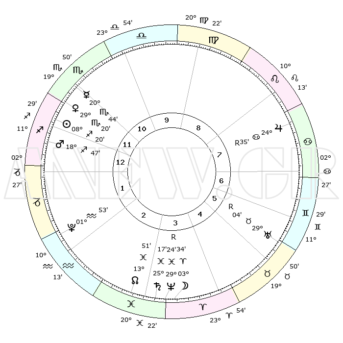 | | ΘΕΣΕΙΣ ΠΛΑΝΗΤΩΝ ΑΣΤΡΟΛΟΓΙΚΟΥ ΧΑΡΤΗ ΤΗΣ ΣΤΙΓΜΗΣ ΑΥΤΗΣ | | | | Πλανήτης | Ζώδιο | Μοίρες | Δεκαήμ. | Σε οίκο | Απόκλιση | | Ακμές των οίκων | | Ηλιος | Τοξότης | 08°18' | Πρώτο | 12 | 21 S 41 | | 1ος | 19°26' | Τοξότης | | Σελήνη | Κριός | 02°60' | Πρώτο | 3 | 02 N 40 | | 2ος | 24°04' | Αιγόκερως | | Ερμής | Σκορπιός | 20°44' | Τρίτο | 11 | 15 S 27 | | 3ος | 02°56' | Ιχθείς | | Αφροδίτη | Σκορπιός | 29°17' | Τρίτο | 12 | 19 S 17 | | 4ος | 08°16' | Κριός | | Αρης | Τοξότης | 18°45' | Δεύτερο | 12 | 23 S 37 | | 5ος | 06°20' | Ταύρος | | Δίας | Καρκίνος | 24°35'R | Τρίτο | 8 | 21 N 21 | | 6ος | 29°00' | Ταύρος | | Κρόνος | Ιχθείς | 25°17' | Τρίτο | 3 | 04 S 03 | | 7ος | 19°26' | Δίδυμοι | | Ουρανός | Ταύρος | 29°05'R | Τρίτο | 6 | 19 N 45 | | 8ος | 24°04' | Καρκίνος | | Ποσειδώνας | Ιχθείς | 29°24'R | Τρίτο | 3 | 01 S 29 | | 9ος | 02°56' | Παρθένος | | Πλούτωνας | Υδροχόος | 01°53' | Πρώτο | 2 | 23 S 24 | | 10ος | 08°16' | Ζυγός | | Β. Δεσμός | Ιχθείς | 13°51' | Δεύτερο | 3 | 06 S 21 | | 11ος | 06°20' | Σκορπιός | | Ωροσκόπος | Τοξότης | 19°26' | Δεύτερο | | | 12ος | 29°00' | Σκορπιός | | Μεσουράνημα | Ζυγός | 08°16' | Πρώτο | | | |