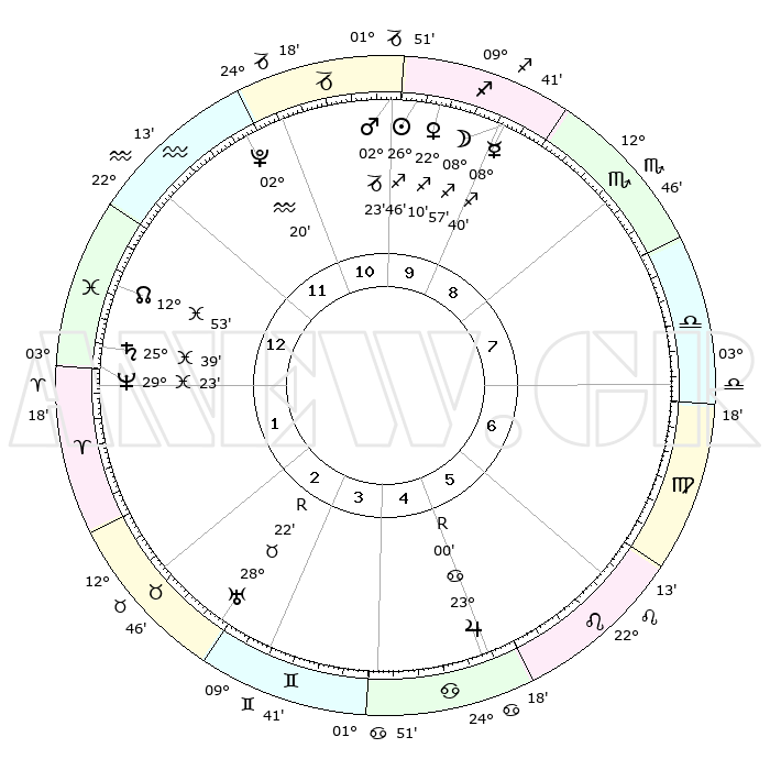 | | ΘΕΣΕΙΣ ΠΛΑΝΗΤΩΝ ΑΣΤΡΟΛΟΓΙΚΟΥ ΧΑΡΤΗ ΤΗΣ ΣΤΙΓΜΗΣ ΑΥΤΗΣ | | | | Πλανήτης | Ζώδιο | Μοίρες | Δεκαήμ. | Σε οίκο | Απόκλιση | | Ακμές των οίκων | | Ηλιος | Τοξότης | 26°24' | Τρίτο | 2 | 23 S 23 | | 1ος | 14°04' | Σκορπιός | | Σελήνη | Τοξότης | 04°45' | Πρώτο | 1 | 25 S 57 | | 2ος | 13°28' | Τοξότης | | Ερμής | Τοξότης | 08°10' | Πρώτο | 1 | 20 S 32 | | 3ος | 16°50' | Αιγόκερως | | Αφροδίτη | Τοξότης | 21°43' | Τρίτο | 2 | 23 S 08 | | 4ος | 22°03' | Υδροχόος | | Αρης | Αιγόκερως | 02°07' | Πρώτο | 2 | 24 S 13 | | 5ος | 24°31' | Ιχθείς | | Δίας | Καρκίνος | 23°02'R | Τρίτο | 9 | 21 N 40 | | 6ος | 21°41' | Κριός | | Κρόνος | Ιχθείς | 25°38' | Τρίτο | 5 | 03 S 51 | | 7ος | 14°04' | Ταύρος | | Ουρανός | Ταύρος | 28°23'R | Τρίτο | 7 | 19 N 36 | | 8ος | 13°28' | Δίδυμοι | | Ποσειδώνας | Ιχθείς | 29°23' | Τρίτο | 5 | 01 S 28 | | 9ος | 16°50' | Καρκίνος | | Πλούτωνας | Υδροχόος | 02°19' | Πρώτο | 3 | 23 S 18 | | 10ος | 22°03' | Λέων | | Β. Δεσμός | Ιχθείς | 12°54' | Δεύτερο | 4 | 06 S 43 | | 11ος | 24°31' | Παρθένος | | Ωροσκόπος | Σκορπιός | 14°04' | Δεύτερο | | | 12ος | 21°41' | Ζυγός | | Μεσουράνημα | Λέων | 22°03' | Τρίτο | | | |