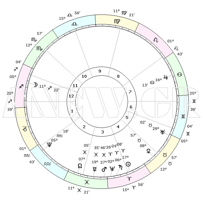 | | ΘΕΣΕΙΣ ΠΛΑΝΗΤΩΝ ΑΣΤΡΟΛΟΓΙΚΟΥ ΧΑΡΤΗ ΤΗΣ ΣΤΙΓΜΗΣ ΑΥΤΗΣ | | | | Πλανήτης | Ζώδιο | Μοίρες | Δεκαήμ. | Σε οίκο | Απόκλιση | | Ακμές των οίκων | | Ηλιος | Κριός | 17°04' | Δεύτερο | 4 | 06 N 42 | | 1ος | 06°26' | Τοξότης | | Σελήνη | Τοξότης | 10°38' | Δεύτερο | 1 | 27 S 08 | | 2ος | 08°33' | Αιγόκερως | | Ερμής | Ιχθείς | 19°31' | Δεύτερο | 3 | 06 S 03 | | 3ος | 15°20' | Υδροχόος | | Αφροδίτη | Ταύρος | 08°52' | Πρώτο | 5 | 14 N 16 | | 4ος | 21°25' | Ιχθείς | | Αρης | Ιχθείς | 27°43' | Τρίτο | 4 | 01 S 51 | | 5ος | 21°34' | Κριός | | Δίας | Καρκίνος | 16°13' | Δεύτερο | 8 | 22 N 49 | | 6ος | 15°46' | Ταύρος | | Κρόνος | Κριός | 06°23' | Πρώτο | 4 | 00 N 35 | | 7ος | 06°26' | Δίδυμοι | | Ουρανός | Ταύρος | 29°02' | Τρίτο | 6 | 19 N 46 | | 8ος | 08°33' | Καρκίνος | | Ποσειδώνας | Κριός | 02°26' | Πρώτο | 4 | 00 S 14 | | 9ος | 15°20' | Λέων | | Πλούτωνας | Υδροχόος | 05°18' | Πρώτο | 2 | 22 S 47 | | 10ος | 21°25' | Παρθένος | | Β. Δεσμός | Ιχθείς | 07°06' | Πρώτο | 3 | 08 S 54 | | 11ος | 21°34' | Ζυγός | | Ωροσκόπος | Τοξότης | 06°26' | Πρώτο | | | 12ος | 15°46' | Σκορπιός | | Μεσουράνημα | Παρθένος | 21°25' | Τρίτο | | | |