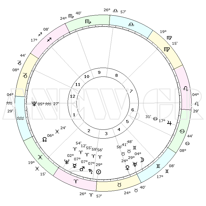 | | ΘΕΣΕΙΣ ΠΛΑΝΗΤΩΝ ΑΣΤΡΟΛΟΓΙΚΟΥ ΧΑΡΤΗ ΤΗΣ ΣΤΙΓΜΗΣ ΑΥΤΗΣ | | | | Πλανήτης | Ζώδιο | Μοίρες | Δεκαήμ. | Σε οίκο | Απόκλιση | | Ακμές των οίκων | | Ηλιος | Κριός | 29°54' | Τρίτο | 3 | 11 N 26 | | 1ος | 15°19' | Αιγόκερως | | Σελήνη | Δίδυμοι | 04°06' | Πρώτο | 5 | 25 N 58 | | 2ος | 26°21' | Υδροχόος | | Ερμής | Κριός | 07°08' | Πρώτο | 3 | 00 N 25 | | 3ος | 06°27' | Κριός | | Αφροδίτη | Ταύρος | 24°53' | Τρίτο | 4 | 19 N 22 | | 4ος | 07°37' | Ταύρος | | Αρης | Κριός | 07°53' | Πρώτο | 3 | 02 N 15 | | 5ος | 01°47' | Δίδυμοι | | Δίας | Καρκίνος | 17°30' | Δεύτερο | 7 | 22 N 40 | | 6ος | 23°01' | Δίδυμοι | | Κρόνος | Κριός | 07°59' | Πρώτο | 3 | 01 N 11 | | 7ος | 15°19' | Καρκίνος | | Ουρανός | Ταύρος | 29°41' | Τρίτο | 4 | 19 N 55 | | 8ος | 26°21' | Λέων | | Ποσειδώνας | Κριός | 02°54' | Πρώτο | 2 | 00 S 03 | | 9ος | 06°27' | Ζυγός | | Πλούτωνας | Υδροχόος | 05°27' | Πρώτο | 1 | 22 S 48 | | 10ος | 07°37' | Σκορπιός | | Β. Δεσμός | Ιχθείς | 06°24' | Πρώτο | 2 | 09 S 10 | | 11ος | 01°47' | Τοξότης | | Ωροσκόπος | Αιγόκερως | 15°19' | Δεύτερο | | | 12ος | 23°01' | Τοξότης | | Μεσουράνημα | Σκορπιός | 07°37' | Πρώτο | | | |