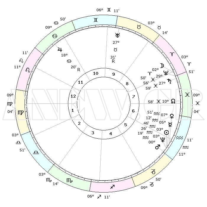 | | ΘΕΣΕΙΣ ΠΛΑΝΗΤΩΝ ΑΣΤΡΟΛΟΓΙΚΟΥ ΧΑΡΤΗ ΤΗΣ ΣΤΙΓΜΗΣ ΑΥΤΗΣ | | | | Πλανήτης | Ζώδιο | Μοίρες | Δεκαήμ. | Σε οίκο | Απόκλιση | | Ακμές των οίκων | | Ηλιος | Υδροχόος | 03°43' | Πρώτο | 6 | 19 S 19 | | 1ος | 24°30' | Λέων | | Σελήνη | Κριός | 02°10' | Πρώτο | 8 | 02 N 43 | | 2ος | 17°46' | Παρθένος | | Ερμής | Υδροχόος | 05°07' | Πρώτο | 6 | 21 S 00 | | 3ος | 15°54' | Ζυγός | | Αφροδίτη | Υδροχόος | 07°48' | Πρώτο | 6 | 19 S 29 | | 4ος | 18°43' | Σκορπιός | | Αρης | Υδροχόος | 00°16' | Πρώτο | 6 | 21 S 04 | | 5ος | 23°18' | Τοξότης | | Δίας | Καρκίνος | 18°20'R | Δεύτερο | 11 | 22 N 28 | | 6ος | 25°44' | Αιγόκερως | | Κρόνος | Ιχθείς | 27°59' | Τρίτο | 8 | 02 S 49 | | 7ος | 24°30' | Υδροχόος | | Ουρανός | Ταύρος | 27°31'R | Τρίτο | 10 | 19 N 25 | | 8ος | 17°46' | Ιχθείς | | Ποσειδώνας | Ιχθείς | 29°56' | Τρίτο | 8 | 01 S 14 | | 9ος | 15°54' | Κριός | | Πλούτωνας | Υδροχόος | 03°26' | Πρώτο | 6 | 23 S 04 | | 10ος | 18°43' | Ταύρος | | Β. Δεσμός | Ιχθείς | 10°58' | Δεύτερο | 7 | 07 S 27 | | 11ος | 23°18' | Δίδυμοι | | Ωροσκόπος | Λέων | 24°30' | Τρίτο | | | 12ος | 25°44' | Καρκίνος | | Μεσουράνημα | Ταύρος | 18°43' | Δεύτερο | | | |