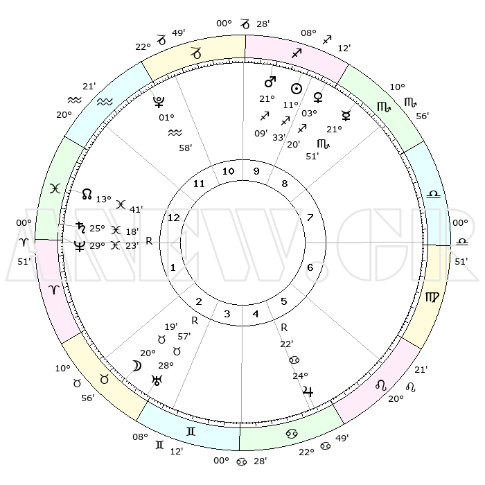 | | ΘΕΣΕΙΣ ΠΛΑΝΗΤΩΝ ΑΣΤΡΟΛΟΓΙΚΟΥ ΧΑΡΤΗ ΤΗΣ ΣΤΙΓΜΗΣ ΑΥΤΗΣ | | | | Πλανήτης | Ζώδιο | Μοίρες | Δεκαήμ. | Σε οίκο | Απόκλιση | | Ακμές των οίκων | | Ηλιος | Τοξότης | 11°32' | Δεύτερο | 9 | 22 S 10 | | 1ος | 12°35' | Ιχθείς | | Σελήνη | Ταύρος | 19°51' | Δεύτερο | 2 | 22 N 05 | | 2ος | 26°28' | Κριός | | Ερμής | Σκορπιός | 21°50' | Τρίτο | 8 | 15 S 42 | | 3ος | 26°47' | Ταύρος | | Αφροδίτη | Τοξότης | 03°18' | Πρώτο | 9 | 20 S 12 | | 4ος | 20°06' | Δίδυμοι | | Αρης | Τοξότης | 21°08' | Τρίτο | 10 | 23 S 49 | | 5ος | 11°53' | Καρκίνος | | Δίας | Καρκίνος | 24°22'R | Τρίτο | 5 | 21 N 24 | | 6ος | 06°52' | Λέων | | Κρόνος | Ιχθείς | 25°18' | Τρίτο | 1 | 04 S 02 | | 7ος | 12°35' | Παρθένος | | Ουρανός | Ταύρος | 28°57'R | Τρίτο | 3 | 19 N 43 | | 8ος | 26°28' | Ζυγός | | Ποσειδώνας | Ιχθείς | 29°23'R | Τρίτο | 1 | 01 S 29 | | 9ος | 26°47' | Σκορπιός | | Πλούτωνας | Υδροχόος | 01°58' | Πρώτο | 11 | 23 S 23 | | 10ος | 20°06' | Τοξότης | | Β. Δεσμός | Ιχθείς | 13°41' | Δεύτερο | 1 | 06 S 25 | | 11ος | 11°53' | Αιγόκερως | | Ωροσκόπος | Ιχθείς | 12°35' | Δεύτερο | | | 12ος | 06°52' | Υδροχόος | | Μεσουράνημα | Τοξότης | 20°06' | Τρίτο | | | |