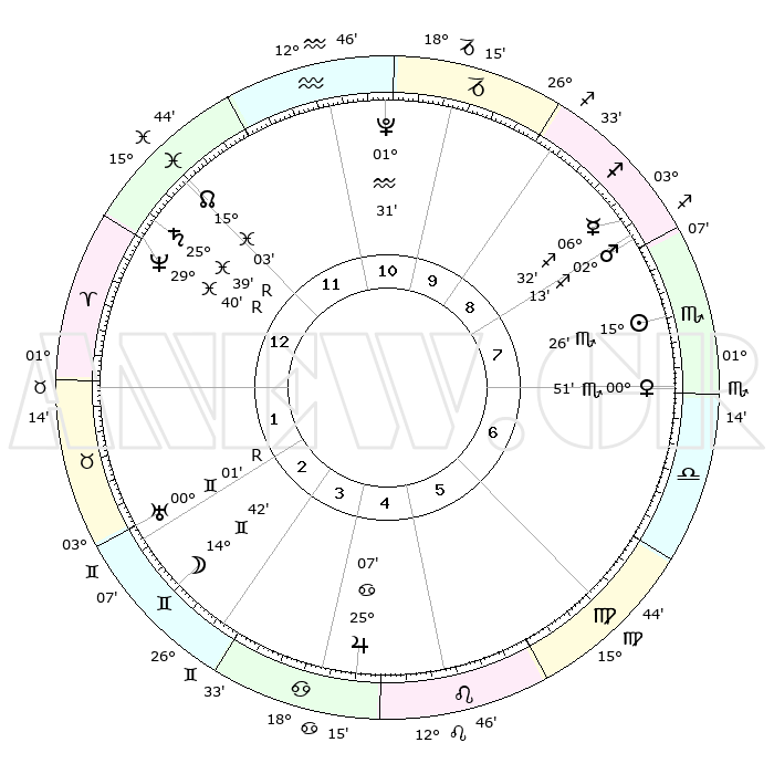| | ΘΕΣΕΙΣ ΠΛΑΝΗΤΩΝ ΑΣΤΡΟΛΟΓΙΚΟΥ ΧΑΡΤΗ ΤΗΣ ΣΤΙΓΜΗΣ ΑΥΤΗΣ | | | | Πλανήτης | Ζώδιο | Μοίρες | Δεκαήμ. | Σε οίκο | Απόκλιση | | Ακμές των οίκων | | Ηλιος | Σκορπιός | 15°16' | Δεύτερο | 9 | 16 S 24 | | 1ος | 25°57' | Αιγόκερως | | Σελήνη | Δίδυμοι | 11°60' | Δεύτερο | 5 | 27 N 14 | | 2ος | 09°20' | Ιχθείς | | Ερμής | Τοξότης | 06°29' | Πρώτο | 10 | 23 S 59 | | 3ος | 18°22' | Κριός | | Αφροδίτη | Σκορπιός | 00°37' | Πρώτο | 9 | 10 S 24 | | 4ος | 17°33' | Ταύρος | | Αρης | Τοξότης | 02°05' | Πρώτο | 10 | 21 S 01 | | 5ος | 10°38' | Δίδυμοι | | Δίας | Καρκίνος | 25°07' | Τρίτο | 6 | 21 N 12 | | 6ος | 01°56' | Καρκίνος | | Κρόνος | Ιχθείς | 25°40'R | Τρίτο | 2 | 03 S 58 | | 7ος | 25°57' | Καρκίνος | | Ουρανός | Δίδυμοι | 00°01'R | Πρώτο | 4 | 19 N 57 | | 8ος | 09°20' | Παρθένος | | Ποσειδώνας | Ιχθείς | 29°40'R | Τρίτο | 2 | 01 S 23 | | 9ος | 18°22' | Ζυγός | | Πλούτωνας | Υδροχόος | 01°31' | Πρώτο | 1 | 23 S 30 | | 10ος | 17°33' | Σκορπιός | | Β. Δεσμός | Ιχθείς | 15°04' | Δεύτερο | 2 | 05 S 53 | | 11ος | 10°38' | Τοξότης | | Ωροσκόπος | Αιγόκερως | 25°57' | Τρίτο | | | 12ος | 01°56' | Αιγόκερως | | Μεσουράνημα | Σκορπιός | 17°33' | Δεύτερο | | | |