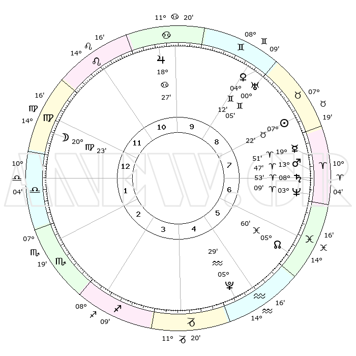 | | ΘΕΣΕΙΣ ΠΛΑΝΗΤΩΝ ΑΣΤΡΟΛΟΓΙΚΟΥ ΧΑΡΤΗ ΤΗΣ ΣΤΙΓΜΗΣ ΑΥΤΗΣ | | | | Πλανήτης | Ζώδιο | Μοίρες | Δεκαήμ. | Σε οίκο | Απόκλιση | | Ακμές των οίκων | | Ηλιος | Ταύρος | 07°18' | Πρώτο | 8 | 13 N 57 | | 1ος | 18°46' | Παρθένος | | Σελήνη | Παρθένος | 19°28' | Δεύτερο | 1 | 03 N 11 | | 2ος | 14°27' | Ζυγός | | Ερμής | Κριός | 19°43' | Δεύτερο | 8 | 05 N 37 | | 3ος | 14°25' | Σκορπιός | | Αφροδίτη | Δίδυμοι | 04°07' | Πρώτο | 9 | 21 N 42 | | 4ος | 17°21' | Τοξότης | | Αρης | Κριός | 13°44' | Δεύτερο | 7 | 04 N 35 | | 5ος | 20°34' | Αιγόκερως | | Δίας | Καρκίνος | 18°27' | Δεύτερο | 10 | 22 N 33 | | 6ος | 21°26' | Υδροχόος | | Κρόνος | Κριός | 08°52' | Πρώτο | 7 | 01 N 31 | | 7ος | 18°46' | Ιχθείς | | Ουρανός | Δίδυμοι | 00°05' | Πρώτο | 9 | 20 N 00 | | 8ος | 14°27' | Κριός | | Ποσειδώνας | Κριός | 03°09' | Πρώτο | 7 | 00 N 03 | | 9ος | 14°25' | Ταύρος | | Πλούτωνας | Υδροχόος | 05°29' | Πρώτο | 5 | 22 S 48 | | 10ος | 17°21' | Δίδυμοι | | Β. Δεσμός | Ιχθείς | 05°60' | Πρώτο | 6 | 09 S 19 | | 11ος | 20°34' | Καρκίνος | | Ωροσκόπος | Παρθένος | 18°46' | Δεύτερο | | | 12ος | 21°26' | Λέων | | Μεσουράνημα | Δίδυμοι | 17°21' | Δεύτερο | | | |